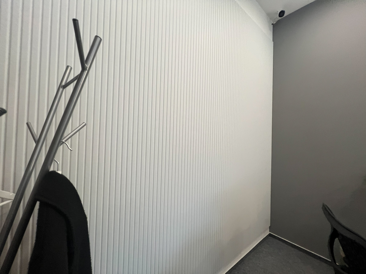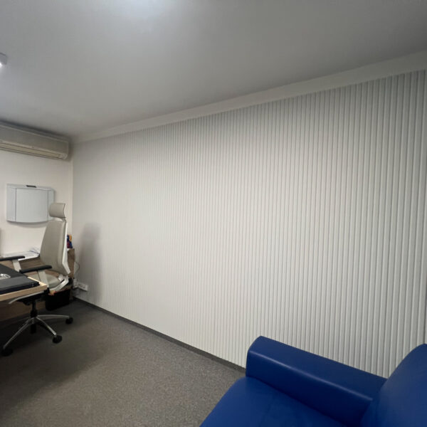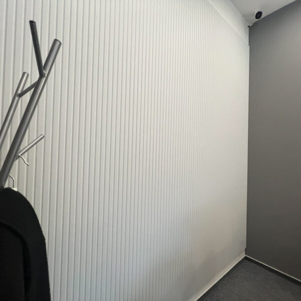 Na stenách sme aplikovali frézované PET panely, ktoré slúžia ako akustický prvok, ale zároveň dopĺňajú estetiku priestoru. Štandardné riešenie sme doplnili o netradičný prvok, akustické panely Ecophon Akutex™, ktoré sme použili na vytvorenie akustickej deliacej steny. Tie boli osadené na existujúcu policovú skrinku tak, aby pohlcovali zvuk z oboch strán a zároveň vytvorili funkčný predel medzi zónami.