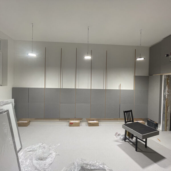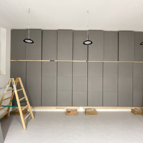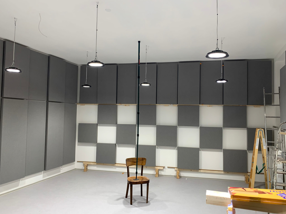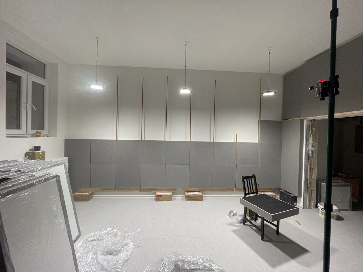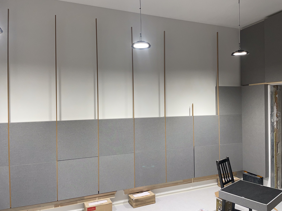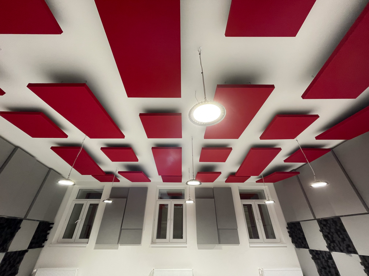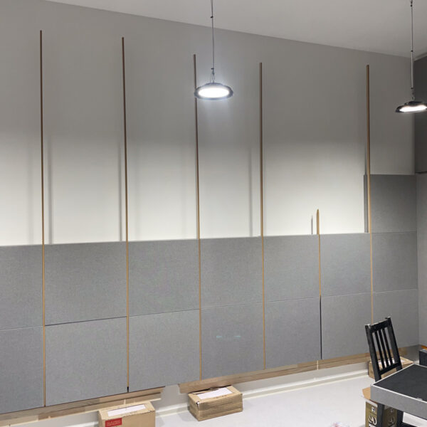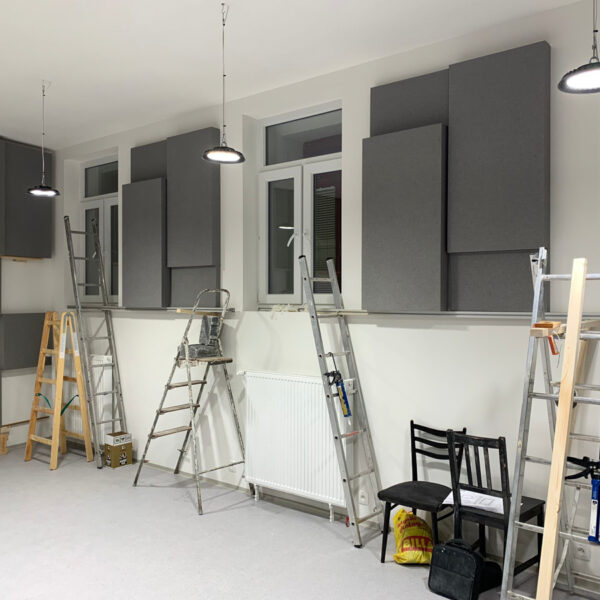 Na základe požiadaviek povereného akustika sme zabezpečili špeciálne panely vyrobené na mieru spoločnosťou Decibel. Tieto panely boli navrhnuté tak, aby spĺňali potrebné hodnoty zvukovej pohltivosti a zároveň esteticky ladili s prostredím učební.