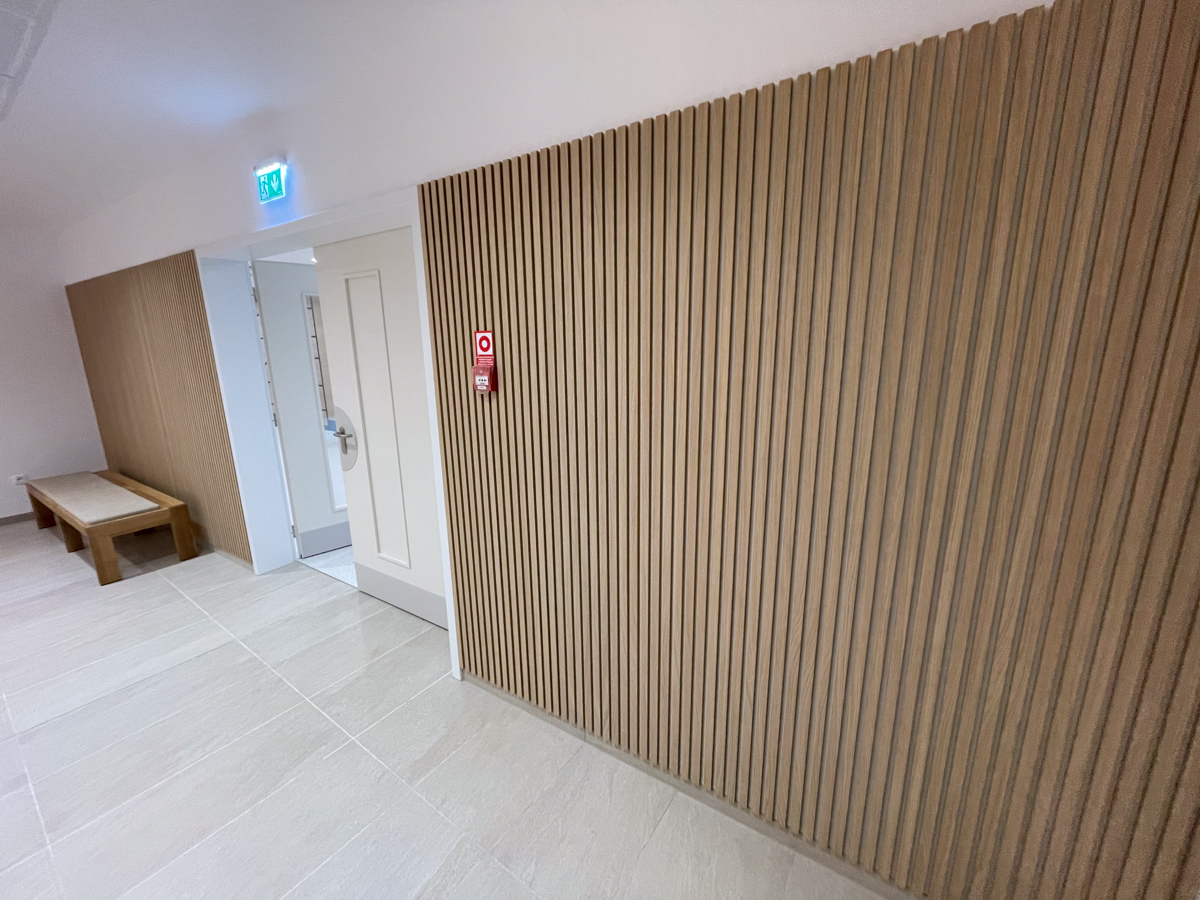 Na stenu pri vchode z kaplnky sme nainštalovali drevené lamely WoodLam s bielou podložkou a dekorom dubu.