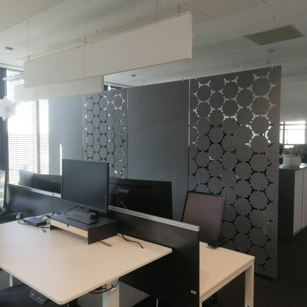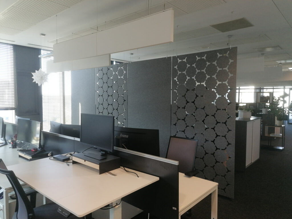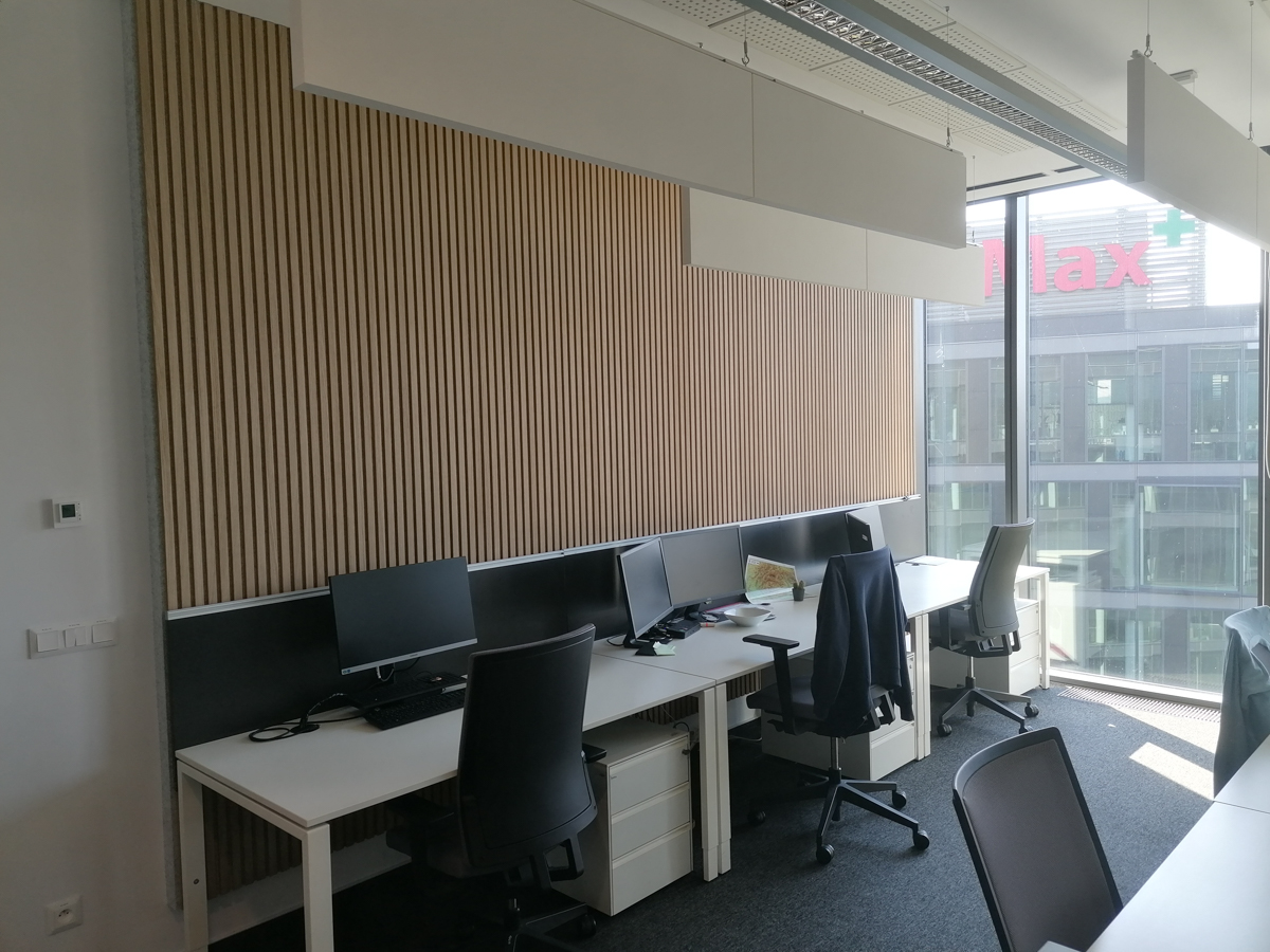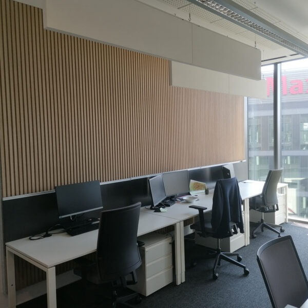 Na riešenie akustických problémov sme do priestoru integrovali podvesené akustické panely Ecophon Solo™ Baffle, ktoré účinne pohlcujú zvuk a zlepšujú priestorovú akustiku. Na stenu sme nainštalovali lamely WoodLam spolu s absorbérmi, ktoré skvelo doplnili celkový design kancelárií.