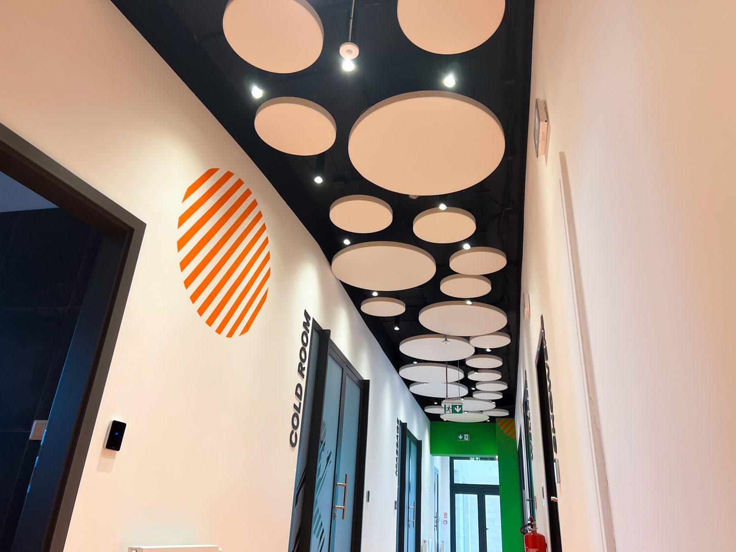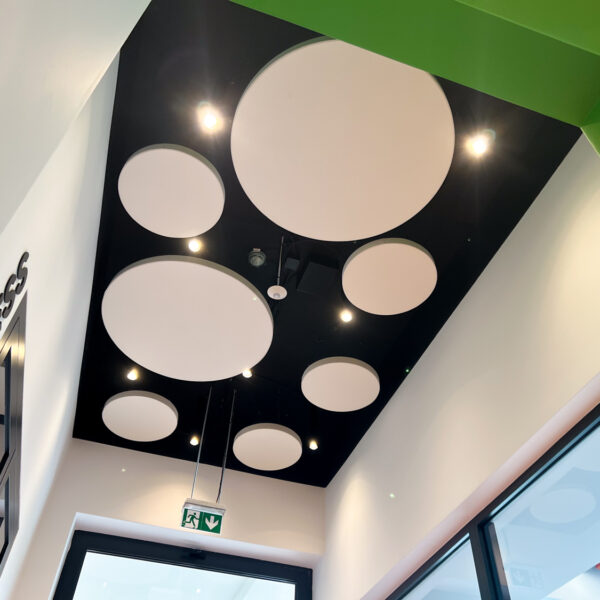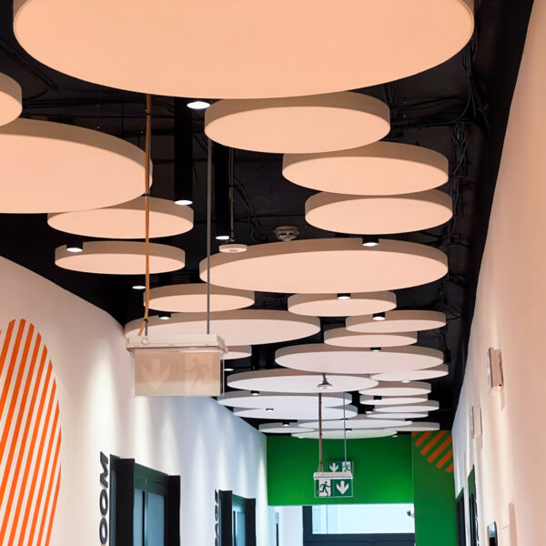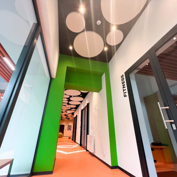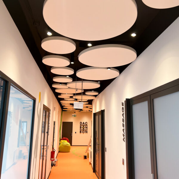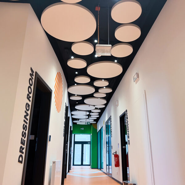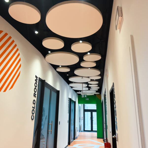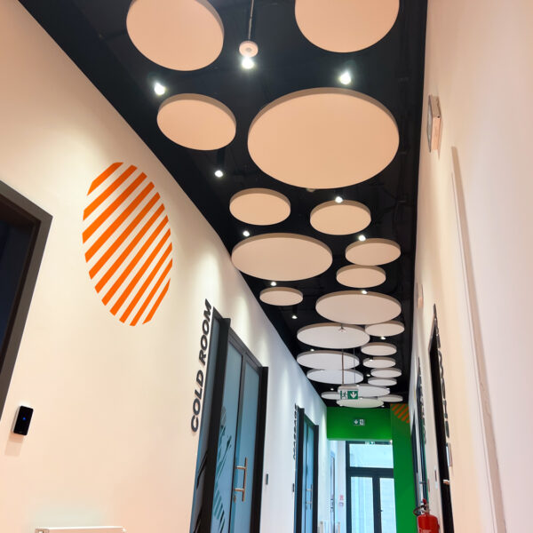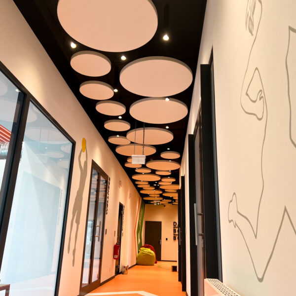 Vzhľadom na nemožnosť inštalácie akustického kazetového stropu kvôli existujúcim svietidlám a potrebe rýchleho prístupu k stropu sme navrhli riešenie pomocou závesných akustických panelov Echo Moon. Tieto panely nielenže efektívne zmiernili nežiaducu ozvenu, ale aj esteticky obohatili vzhľad stropu v chodbe.