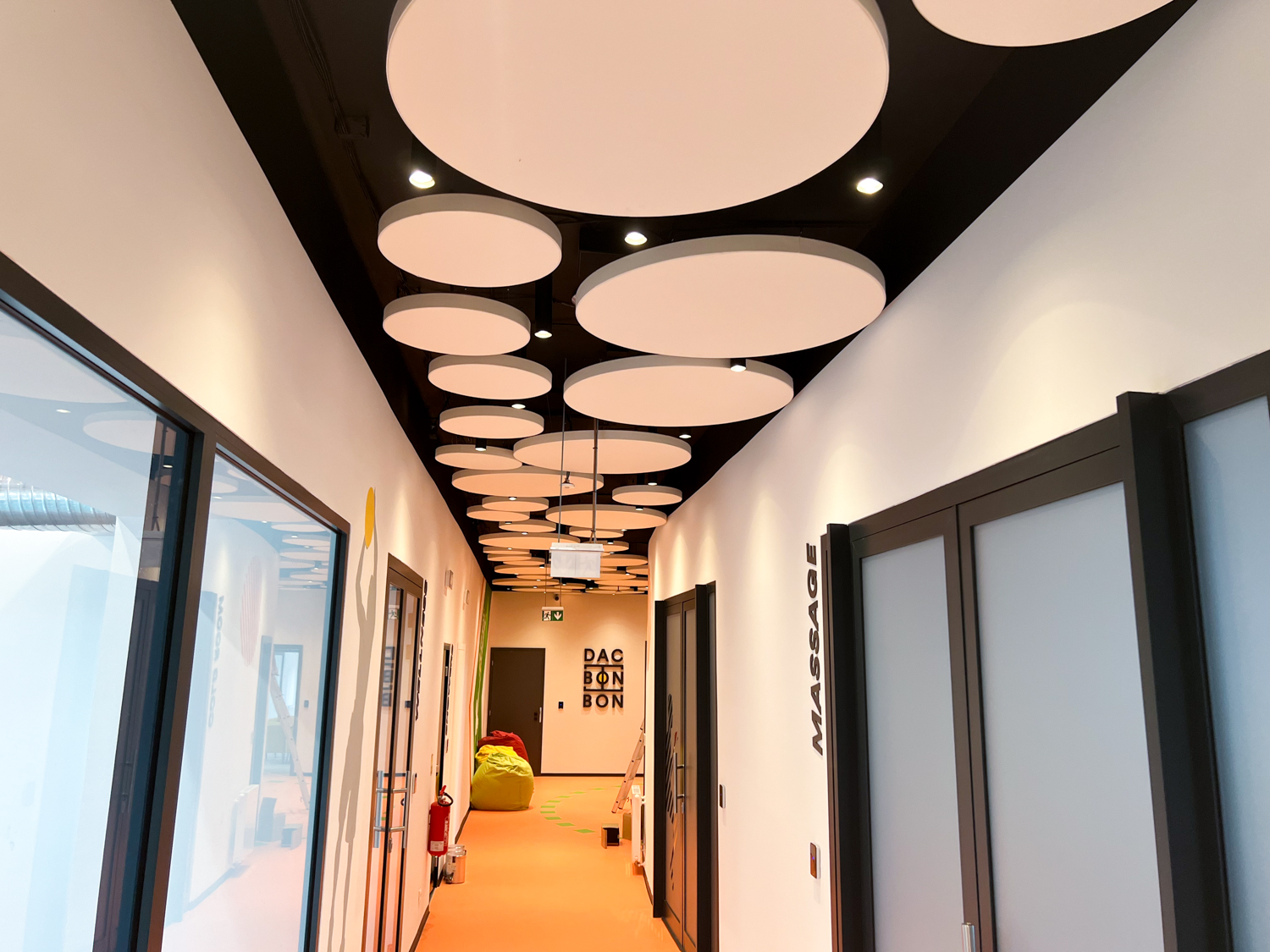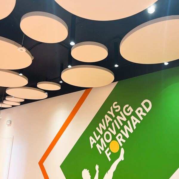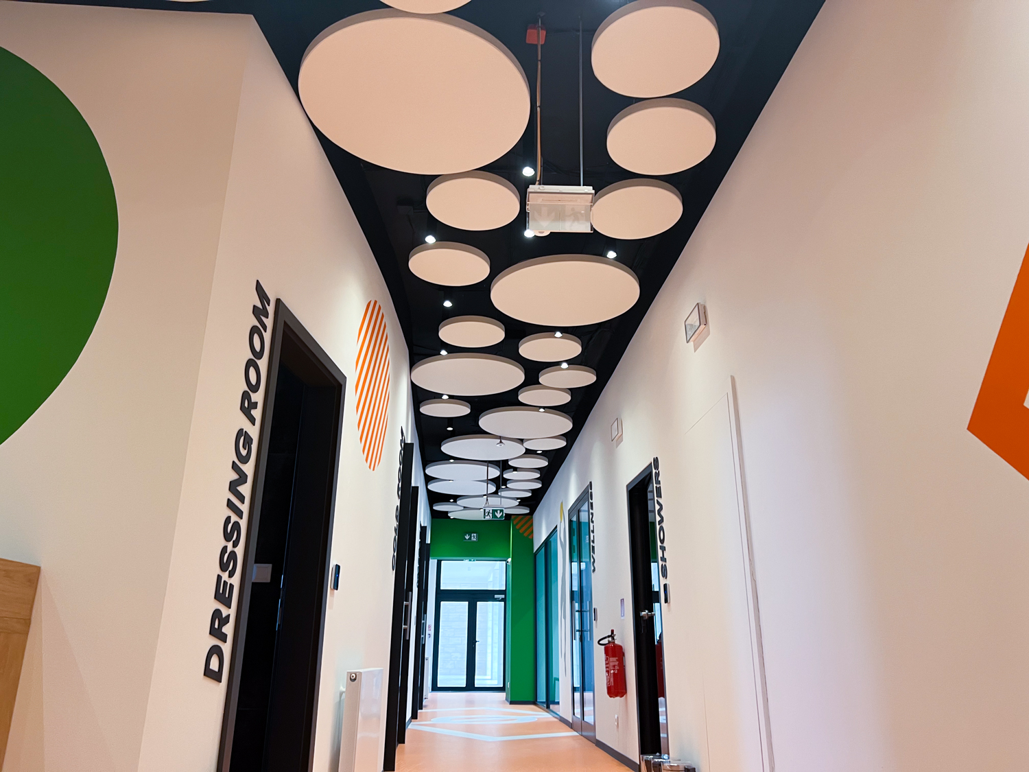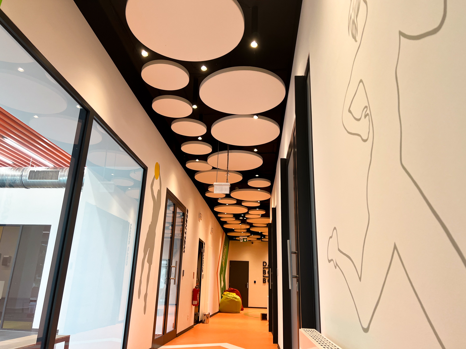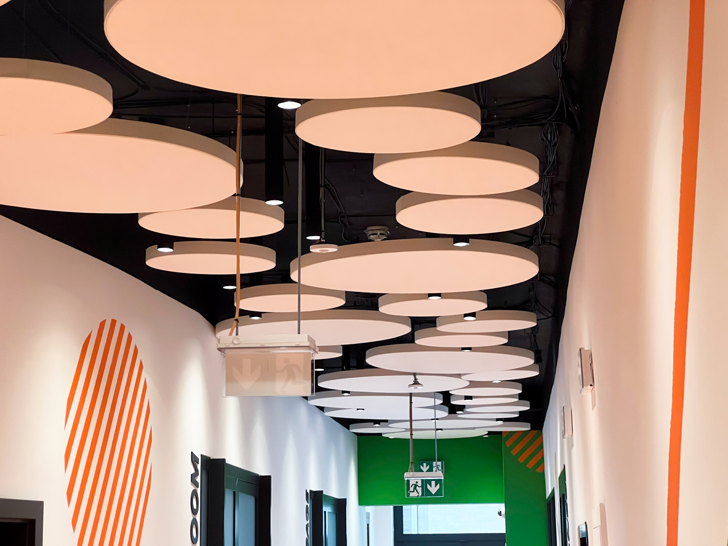 Vzhľadom na nemožnosť inštalácie akustického kazetového stropu kvôli existujúcim svietidlám a potrebe rýchleho prístupu k stropu sme navrhli riešenie pomocou závesných akustických panelov Echo Moon. Tieto panely nielenže efektívne zmiernili nežiaducu ozvenu, ale aj esteticky obohatili vzhľad stropu v chodbe.