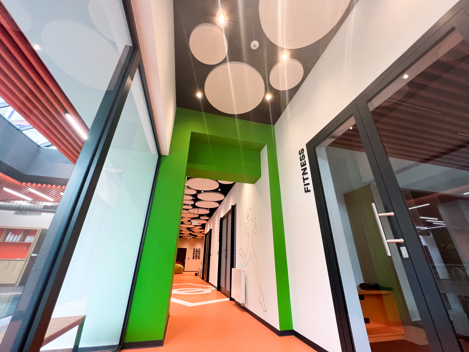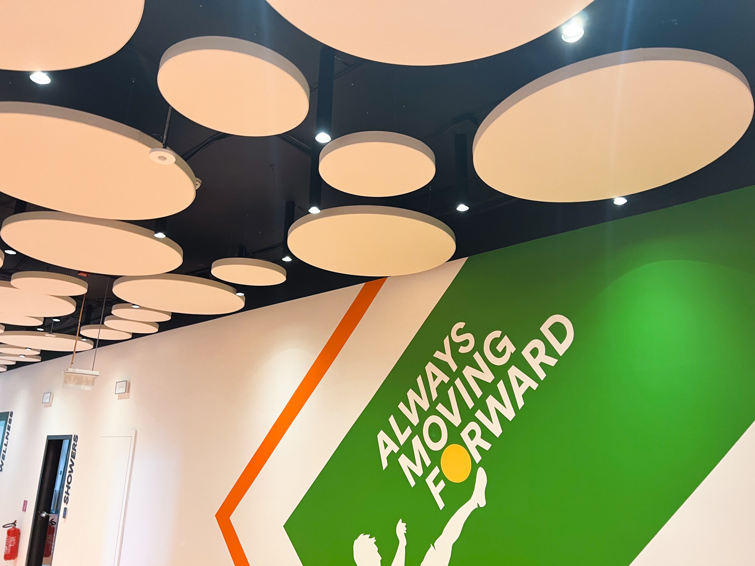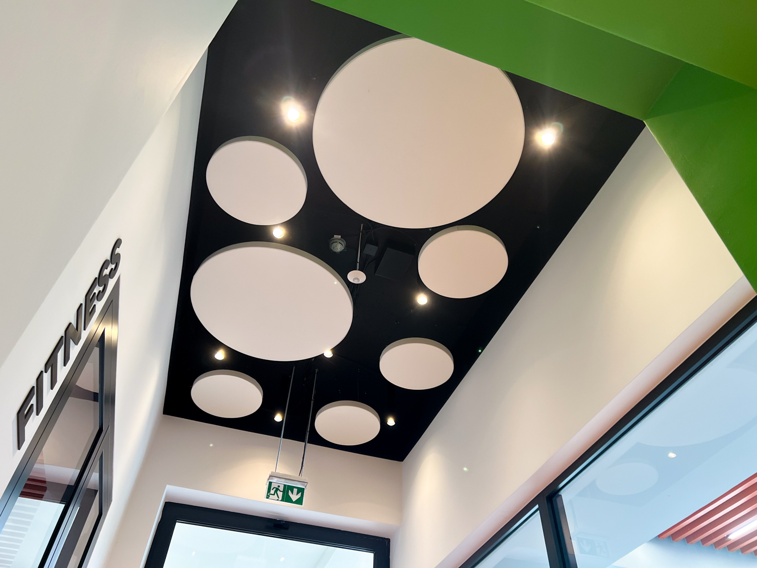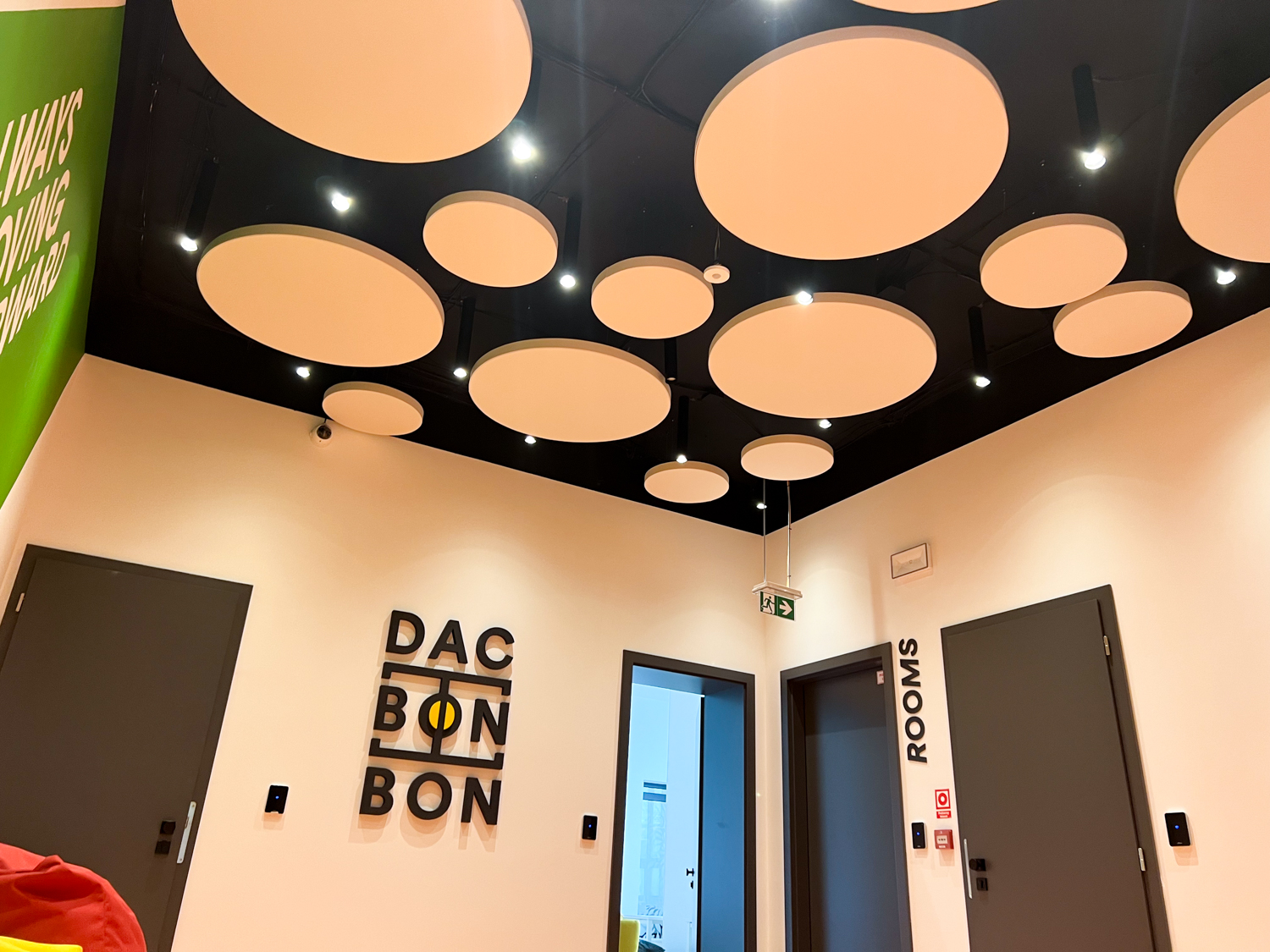 Vzhľadom na nemožnosť inštalácie akustického kazetového stropu kvôli existujúcim svietidlám a potrebe rýchleho prístupu k stropu sme navrhli riešenie pomocou závesných akustických panelov Echo Moon. Tieto panely nielenže efektívne zmiernili nežiaducu ozvenu, ale aj esteticky obohatili vzhľad stropu v chodbe.