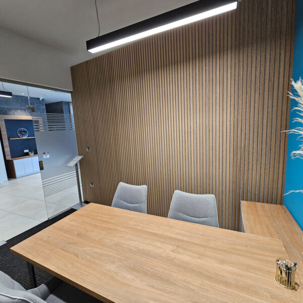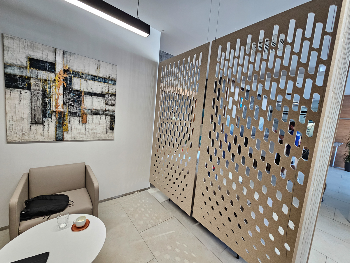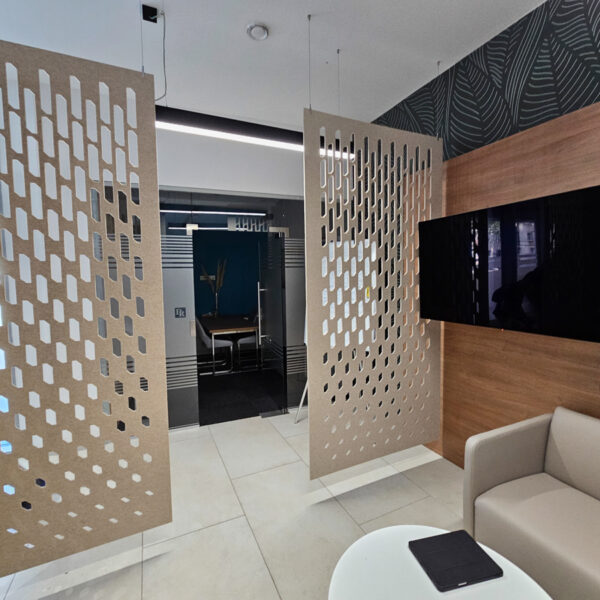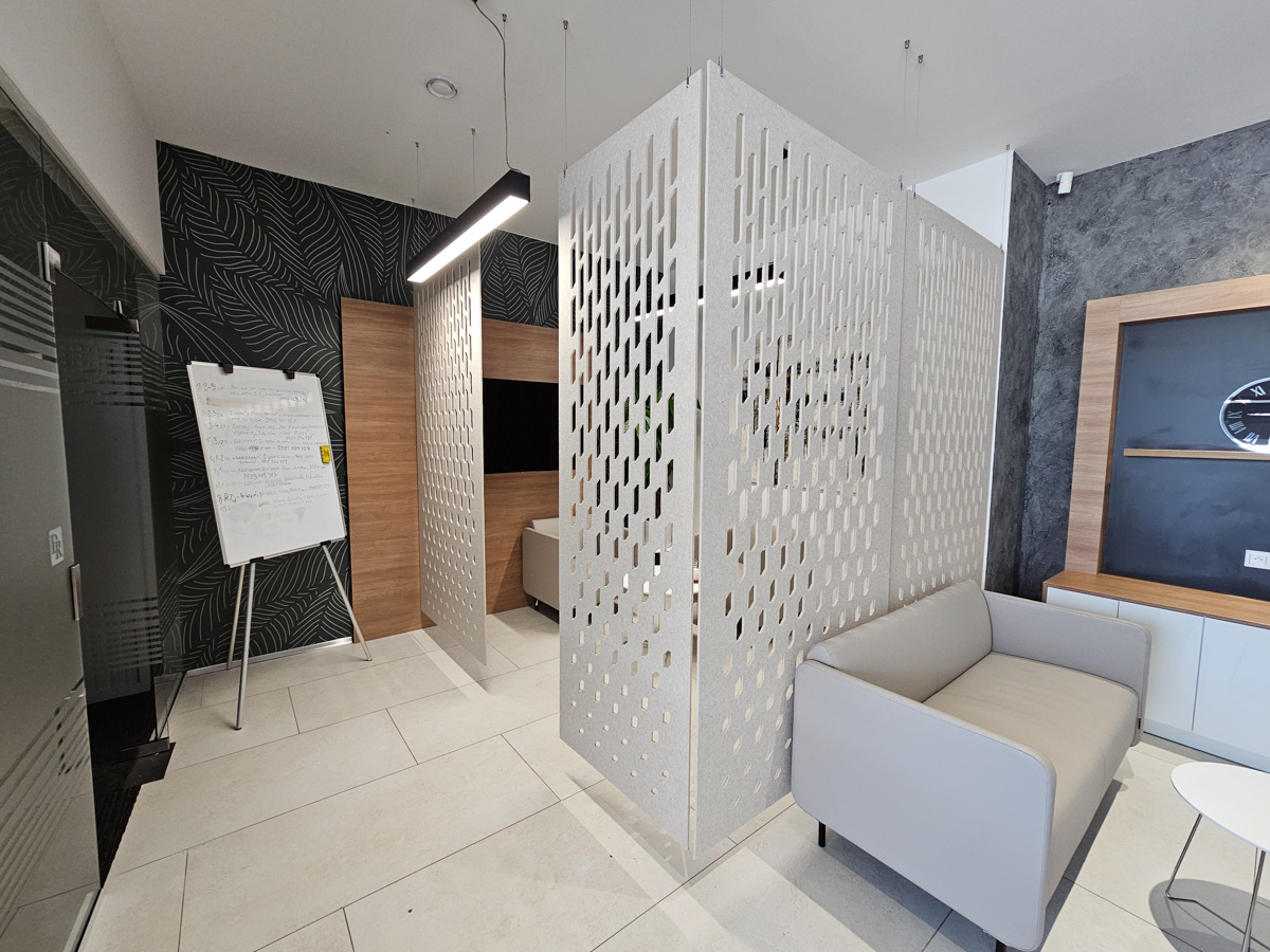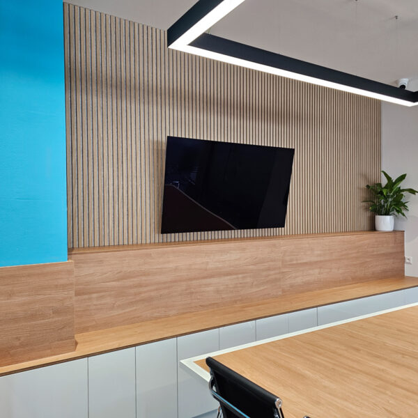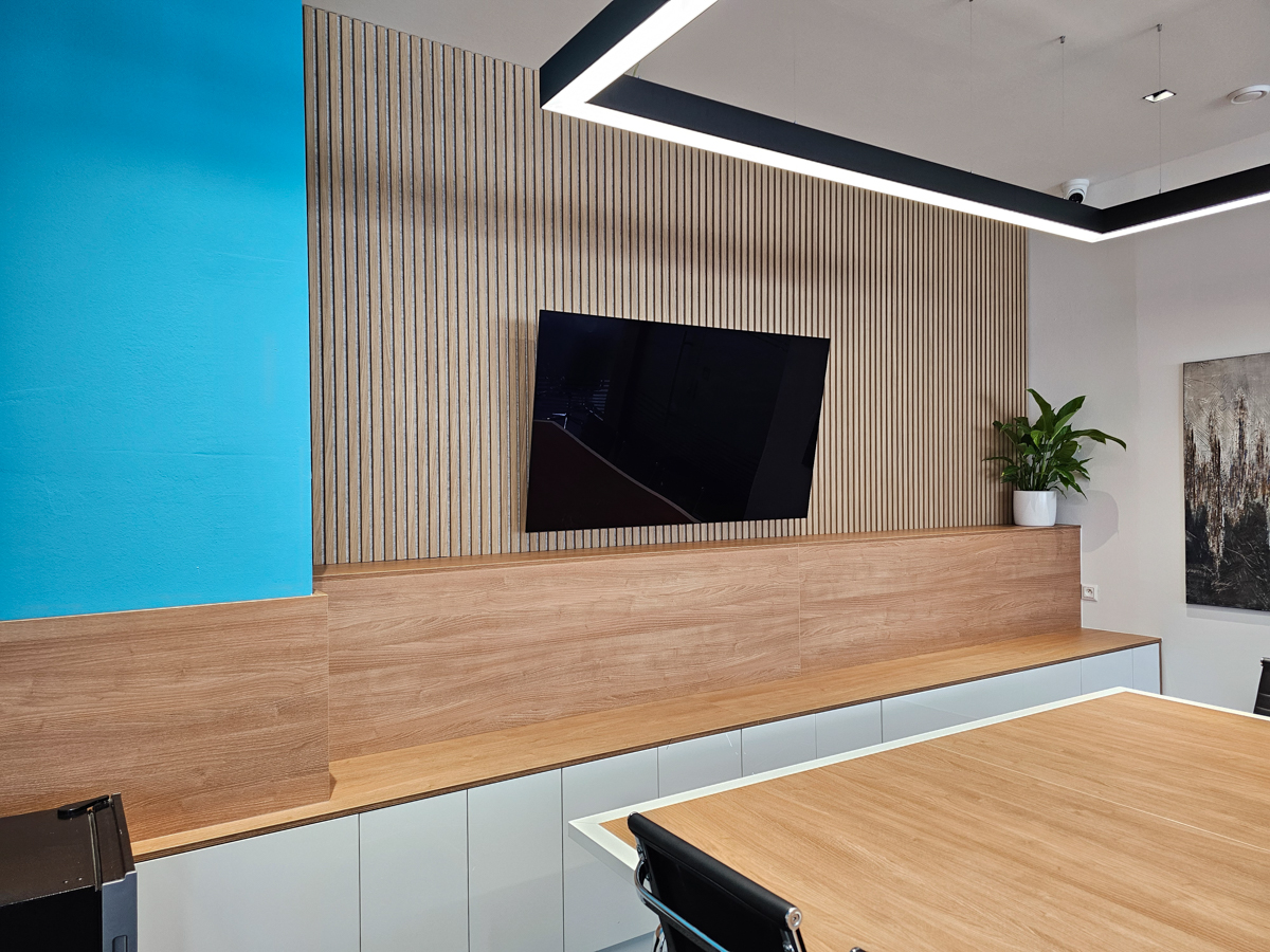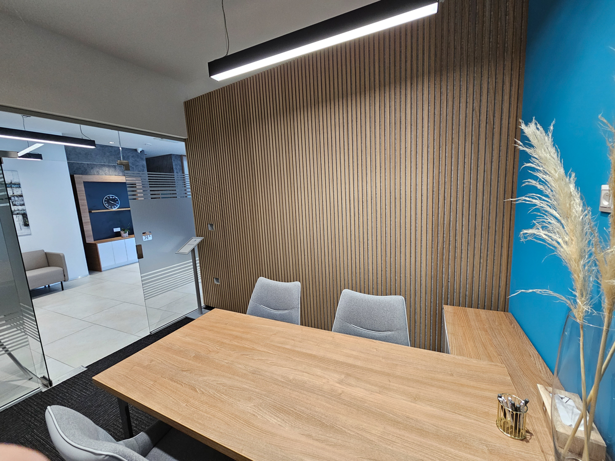 Náš tím odborníkov navrhol a zrealizoval riešenie, ktoré kombinovalo lamelový obklad WoodLam a ARTWORK PET Acoustic panely. Tieto prvky nielenže výrazne zlepšili akustické vlastnosti zasadacích miestností, ale zároveň vylepšili celkový vzhľad priestorov.