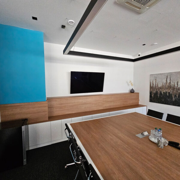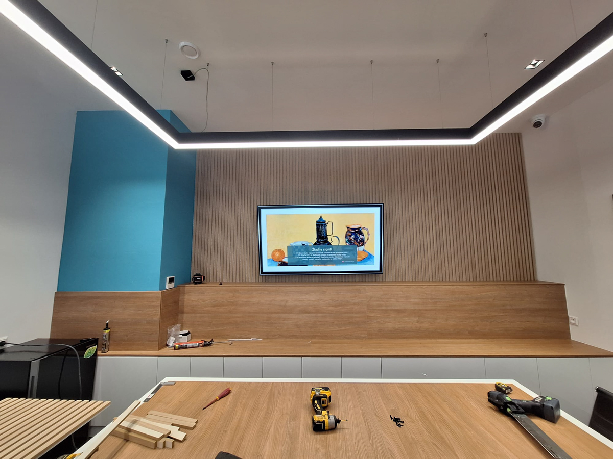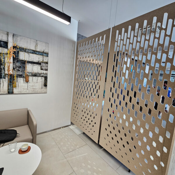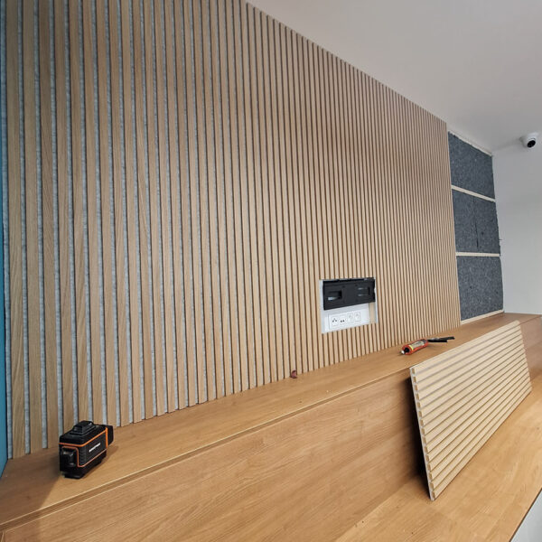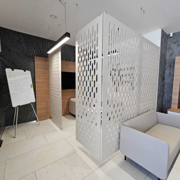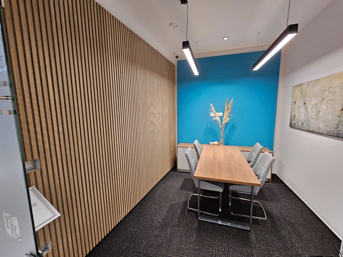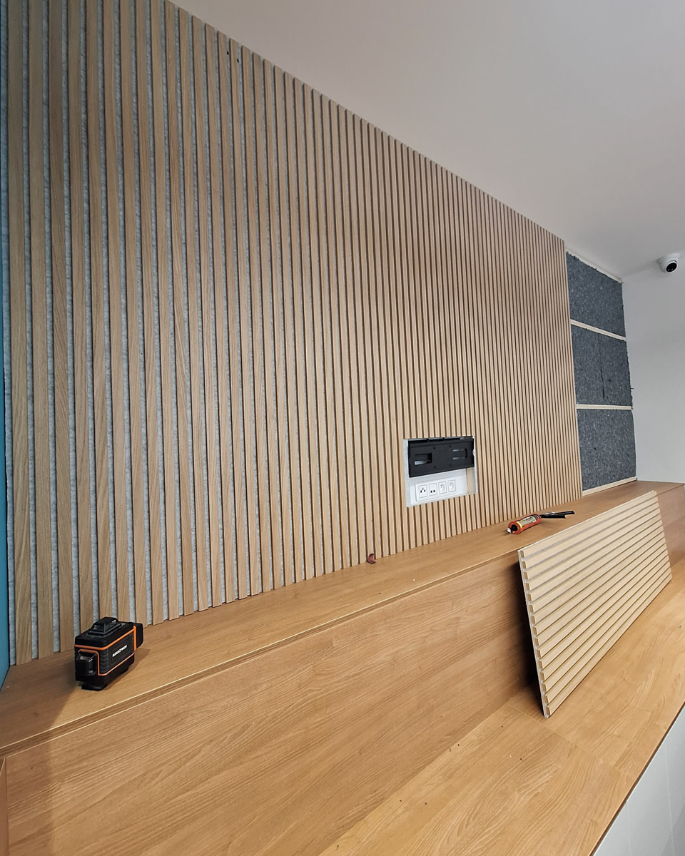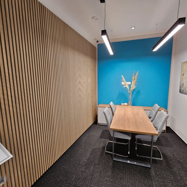 Náš tím odborníkov navrhol a zrealizoval riešenie, ktoré kombinovalo lamelový obklad WoodLam a ARTWORK PET Acoustic panely. Tieto prvky nielenže výrazne zlepšili akustické vlastnosti zasadacích miestností, ale zároveň vylepšili celkový vzhľad priestorov.