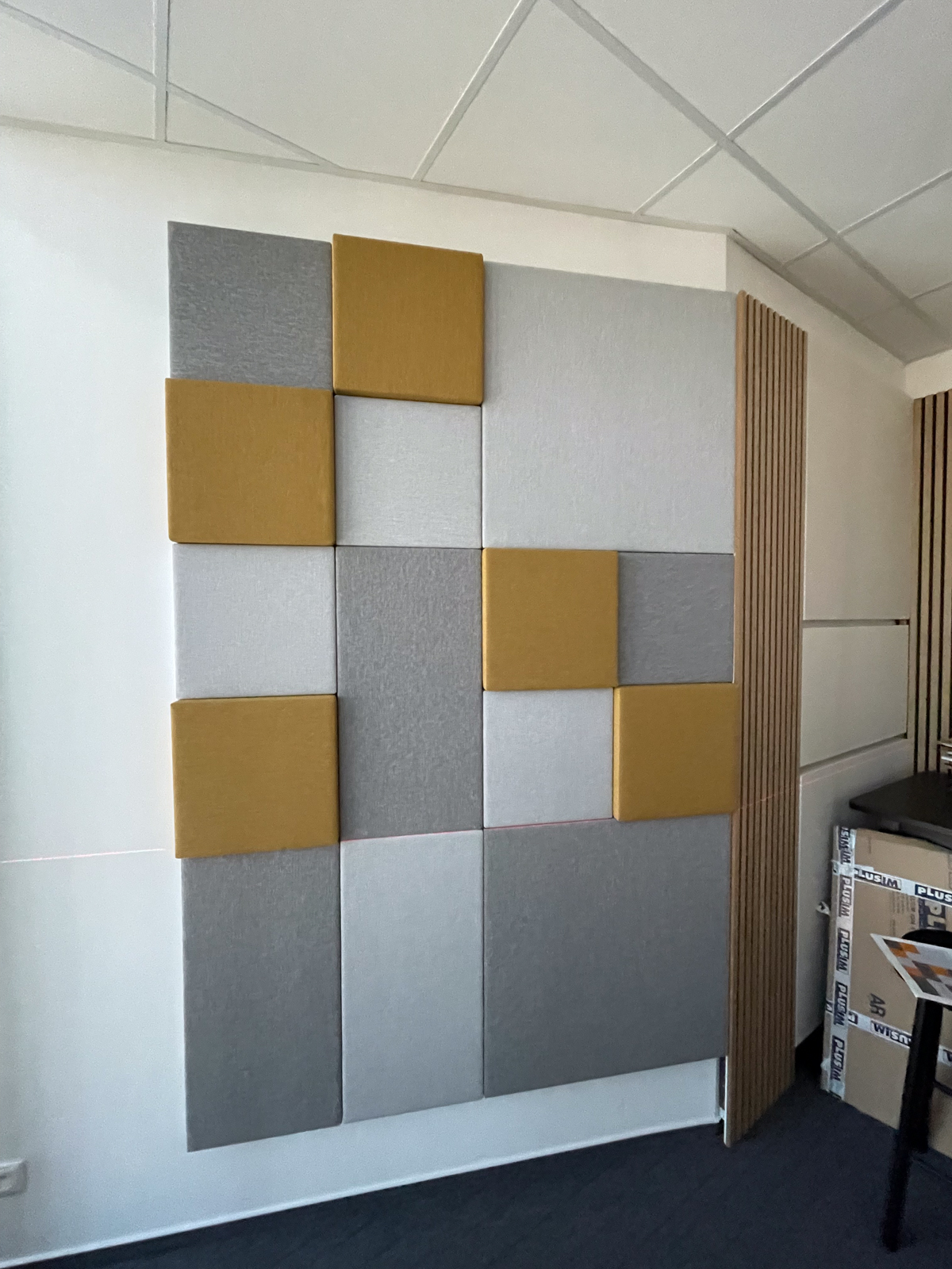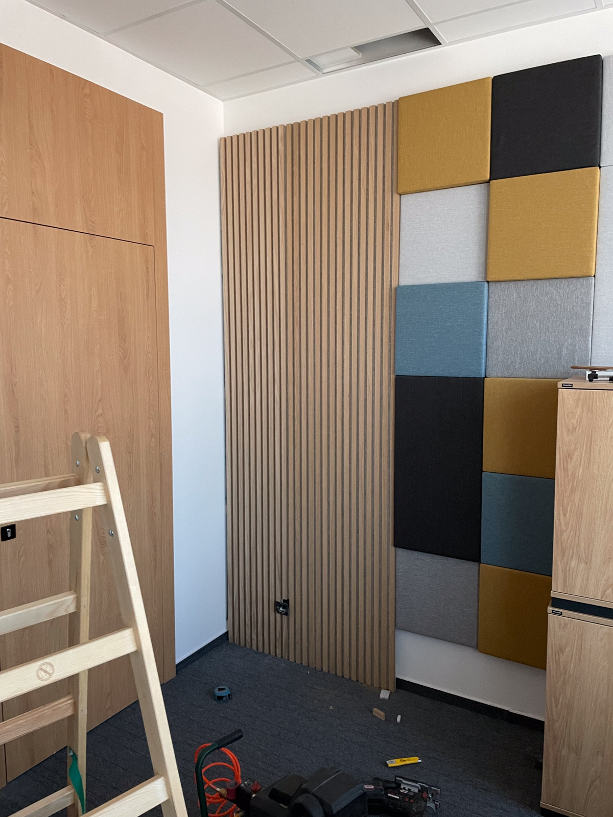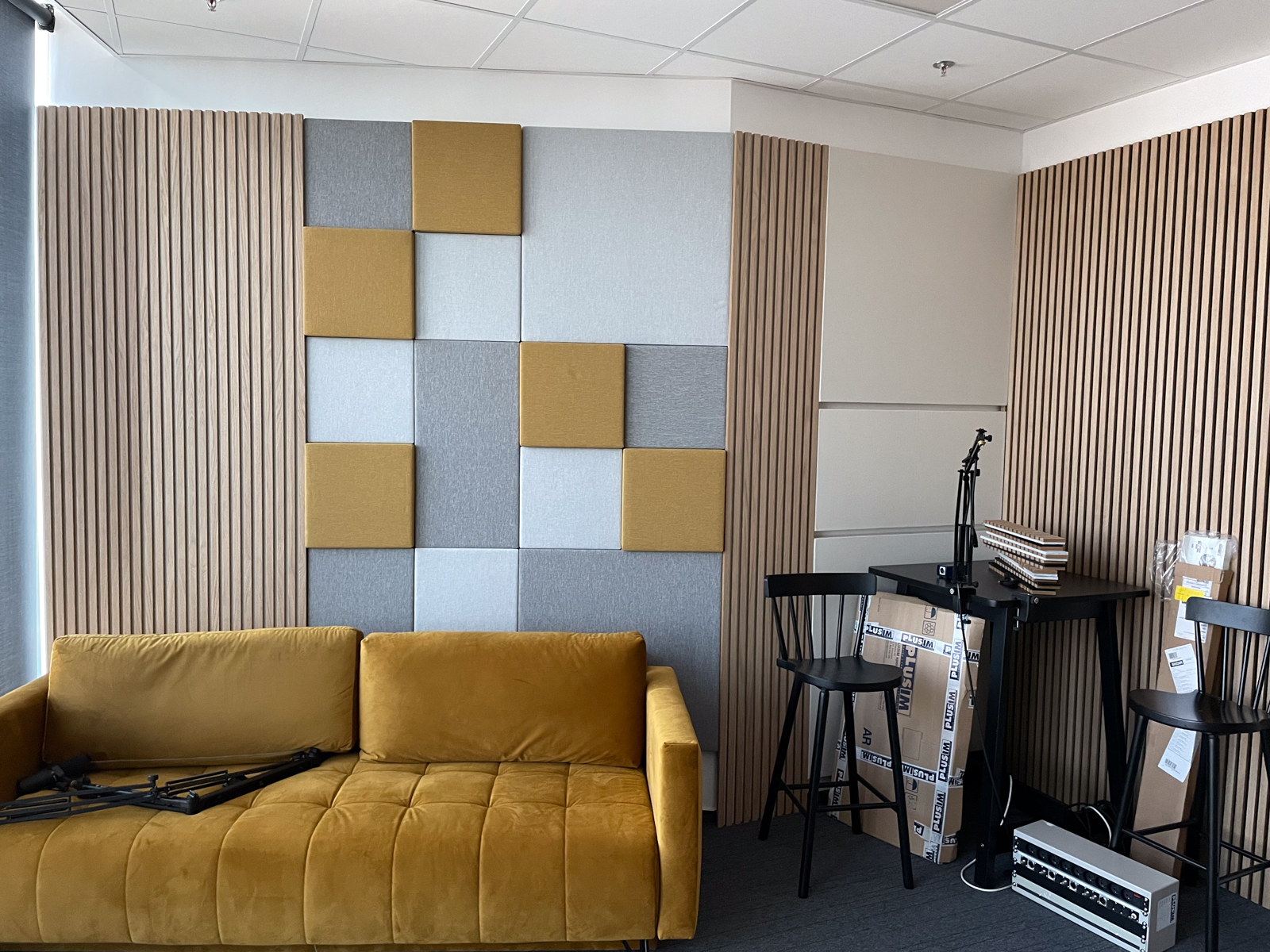 Klienti si sami navrhli dizajn a farbu akustických panelov, v tomto projekte sme použili typ akustických panelov MODUS Light. Panely žiadali osadiť v ich podcastovej miestnosti.