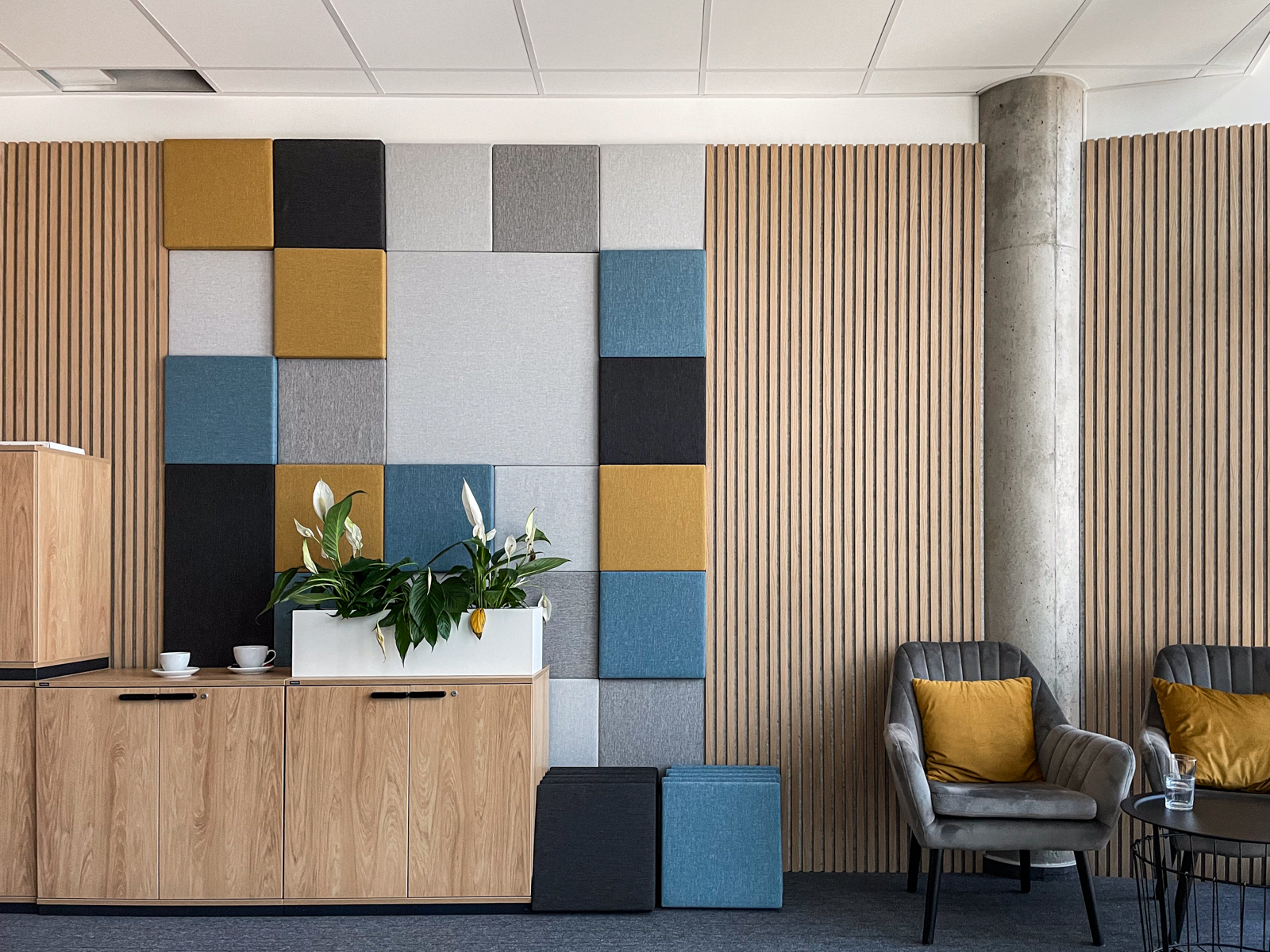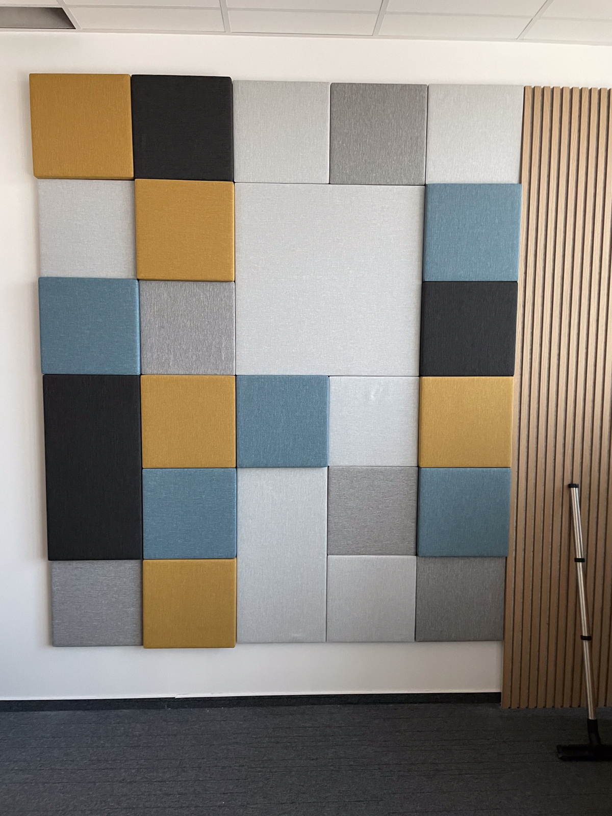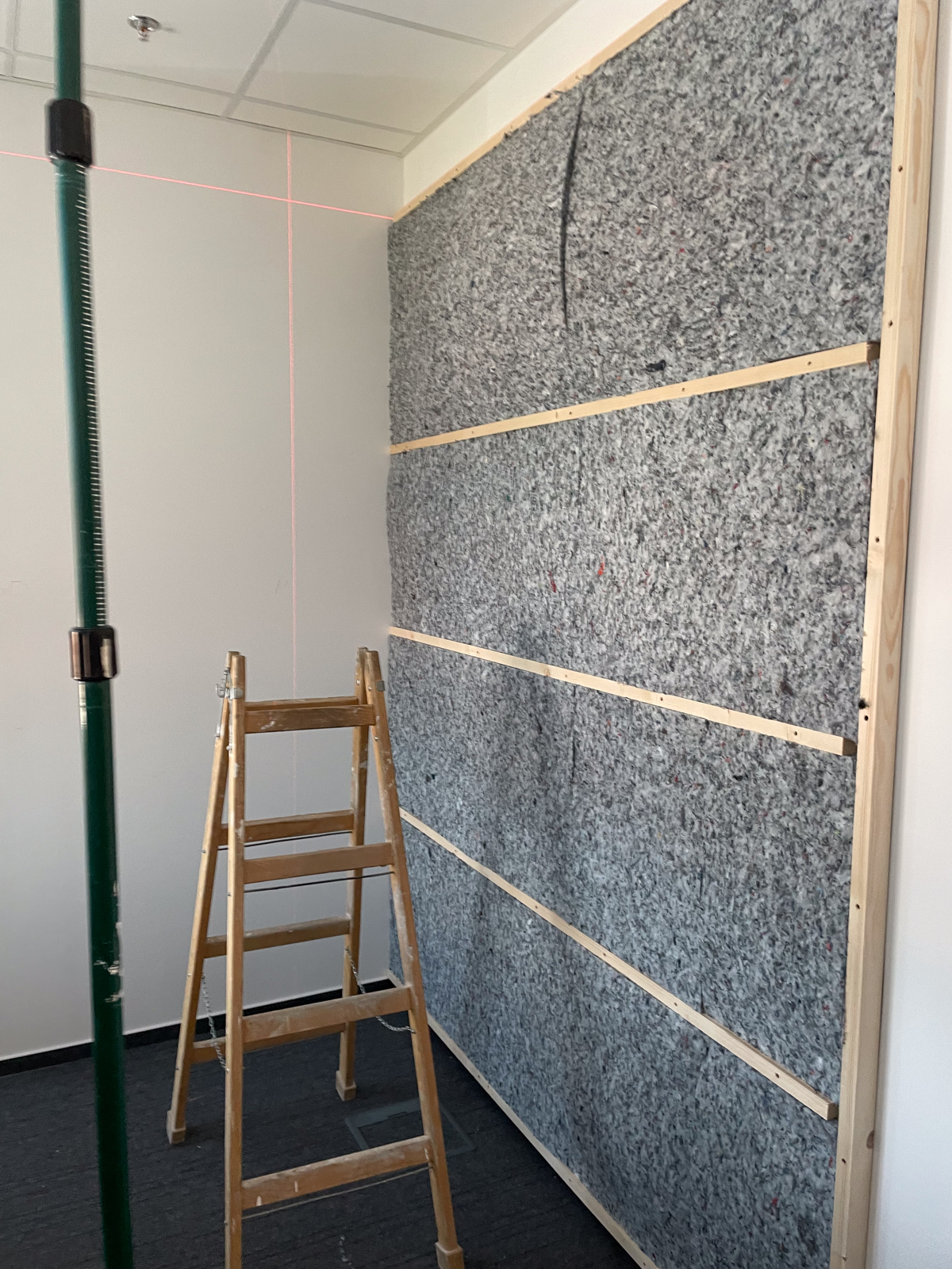 Klienti si sami navrhli dizajn a farbu akustických panelov, v tomto projekte sme použili typ akustických panelov MODUS Light. Panely žiadali osadiť v ich podcastovej miestnosti.