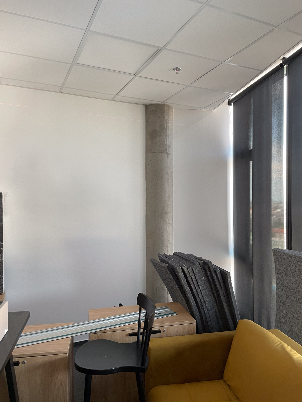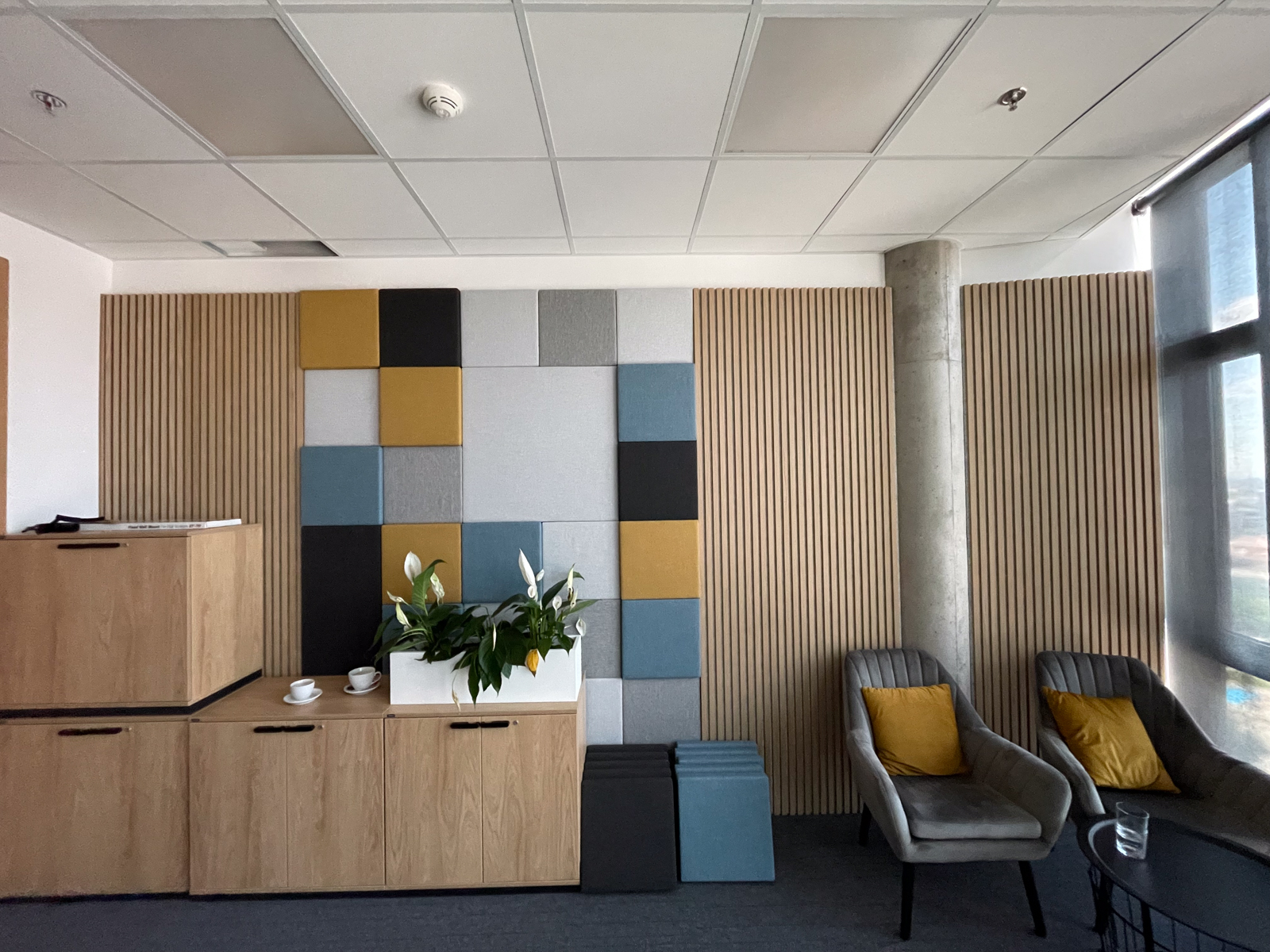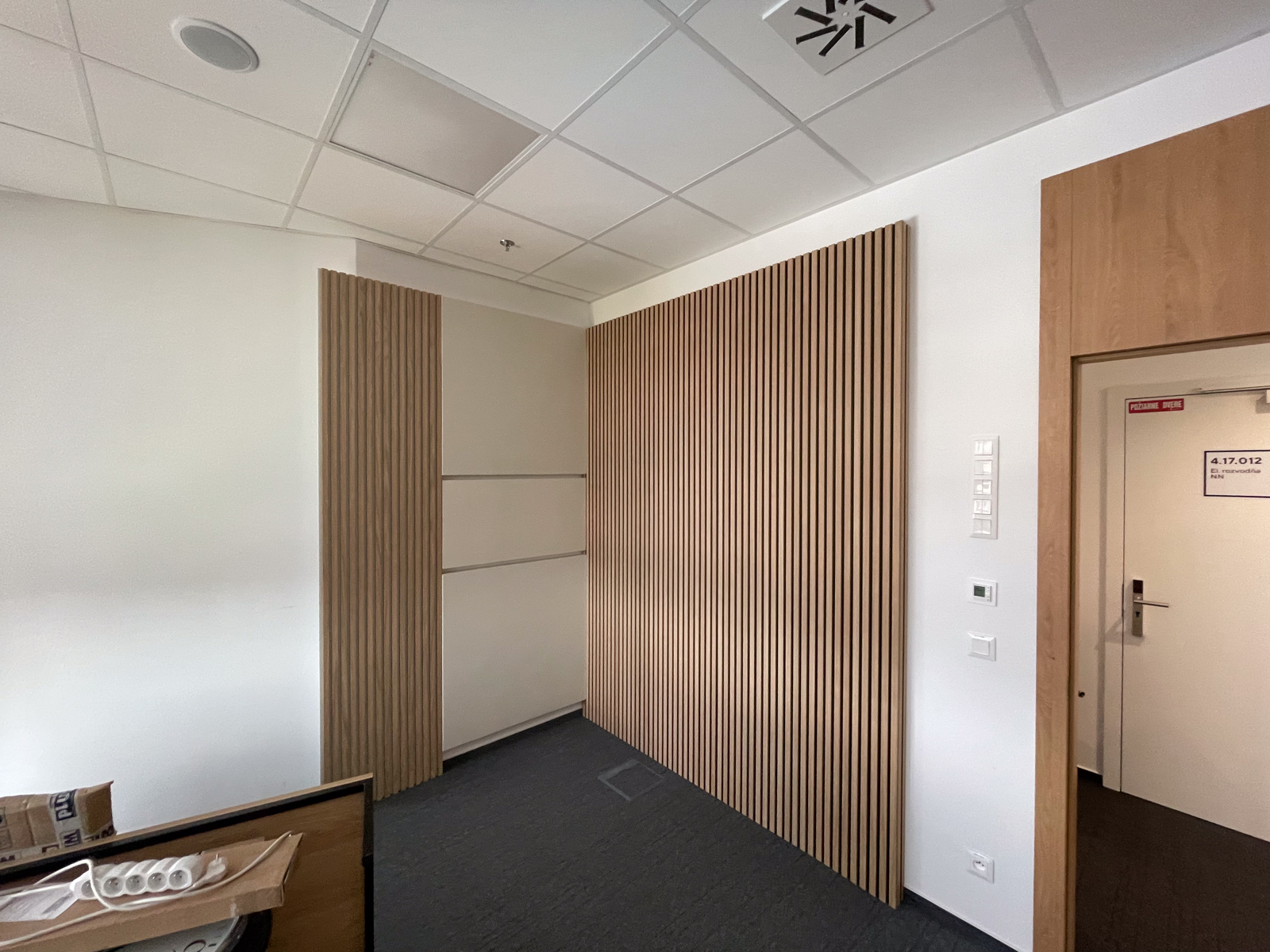 Cieľom tejto realizácie bolo zlepšiť akustiku pre lepšiu kvalitu nahrávania podcastov a rozhovorov. Okrem akustických panelov sme odporučili vymeniť kazety kazetového stropu za akustické kazety Ecophon Focus™ A pre ešte lepšie zníženie času dozvuku.