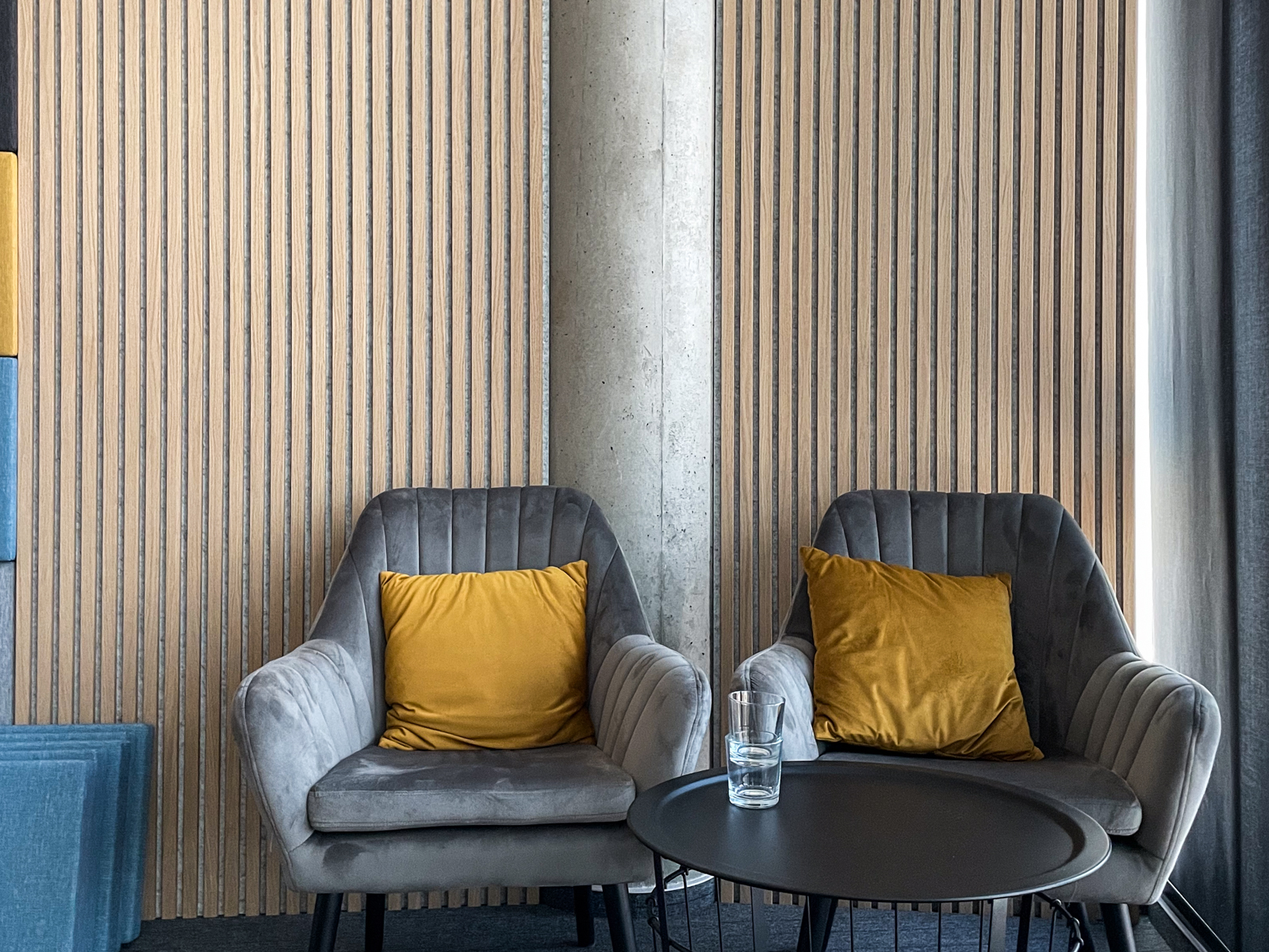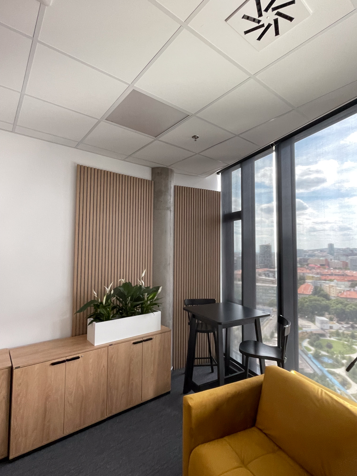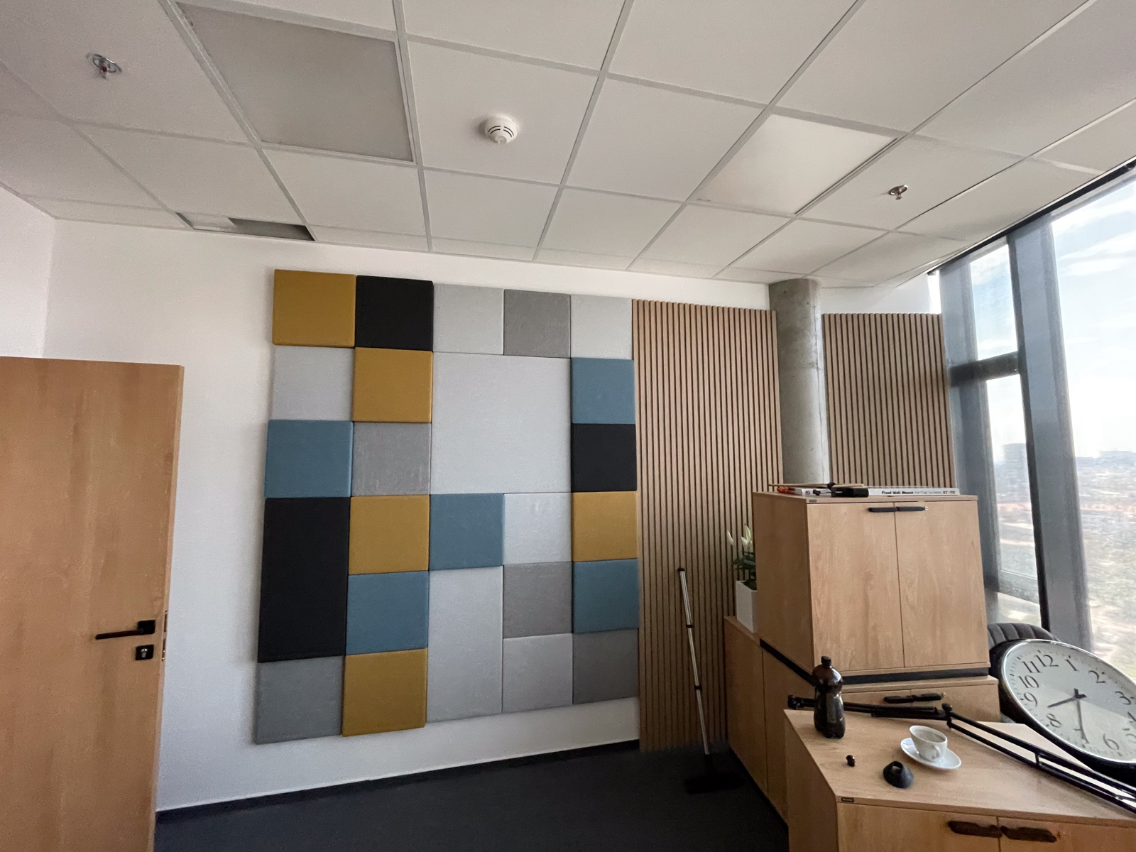 Cieľom tejto realizácie bolo zlepšiť akustiku pre lepšiu kvalitu nahrávania podcastov a rozhovorov. Okrem akustických panelov sme odporučili vymeniť kazety kazetového stropu za akustické kazety Ecophon Focus™ A pre ešte lepšie zníženie času dozvuku.