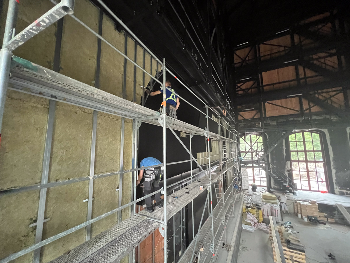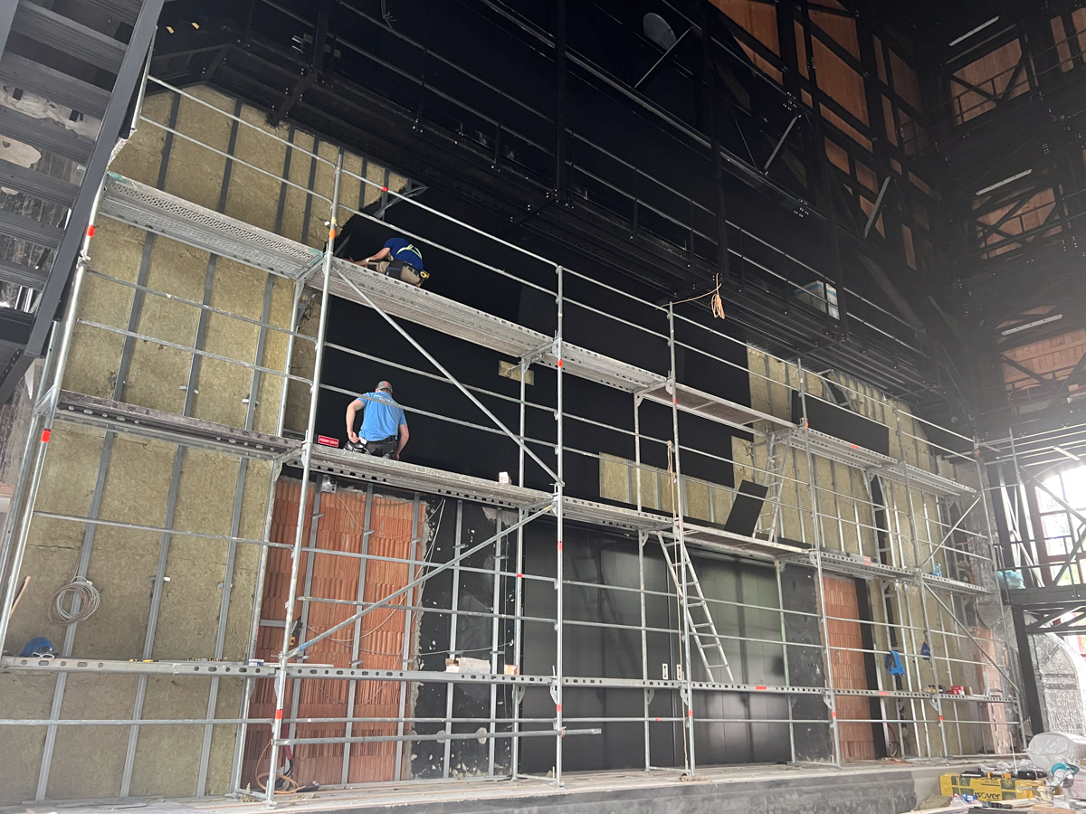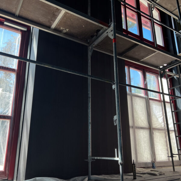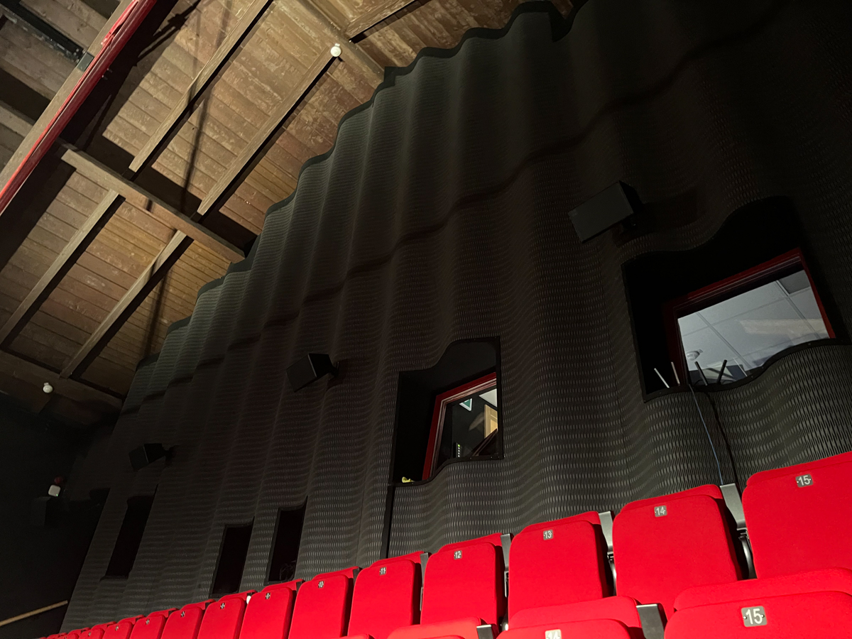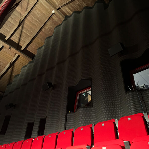 Najväčší podiel plochy tvorí čierna plsť Pro Reverba v protipožiarnej úprave, montovaná na rošt spolu s minerálnou vlnou. Hrúbky výplne boli prispôsobené podľa požiadaviek akustickej štúdie a aplikované najmä na miesta, ktoré neprichádzajú do priameho kontaktu s divákmi.