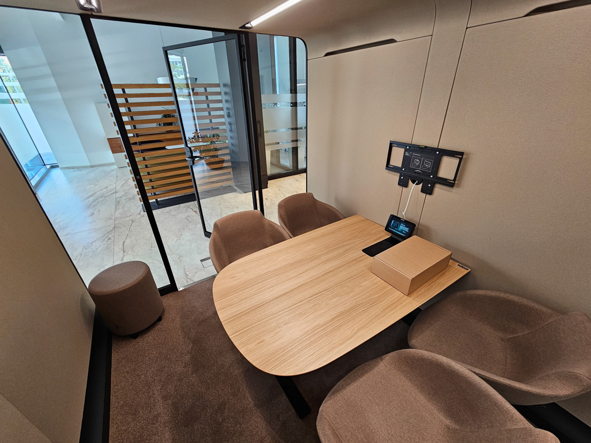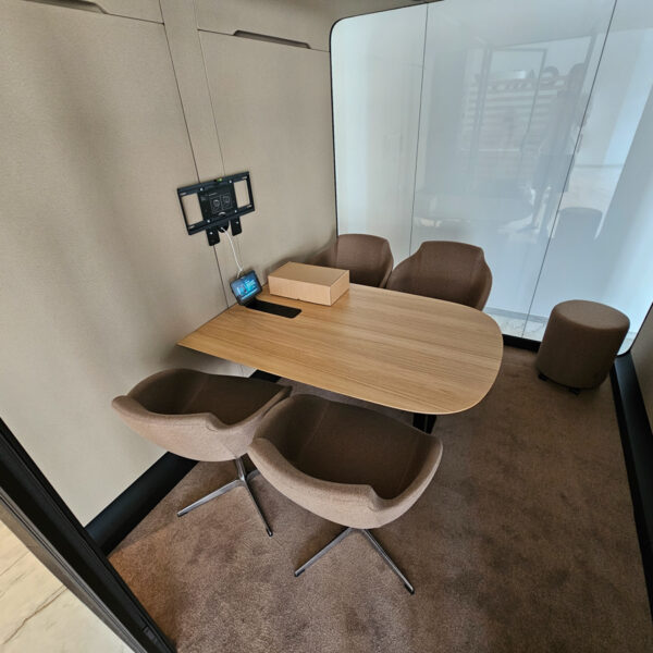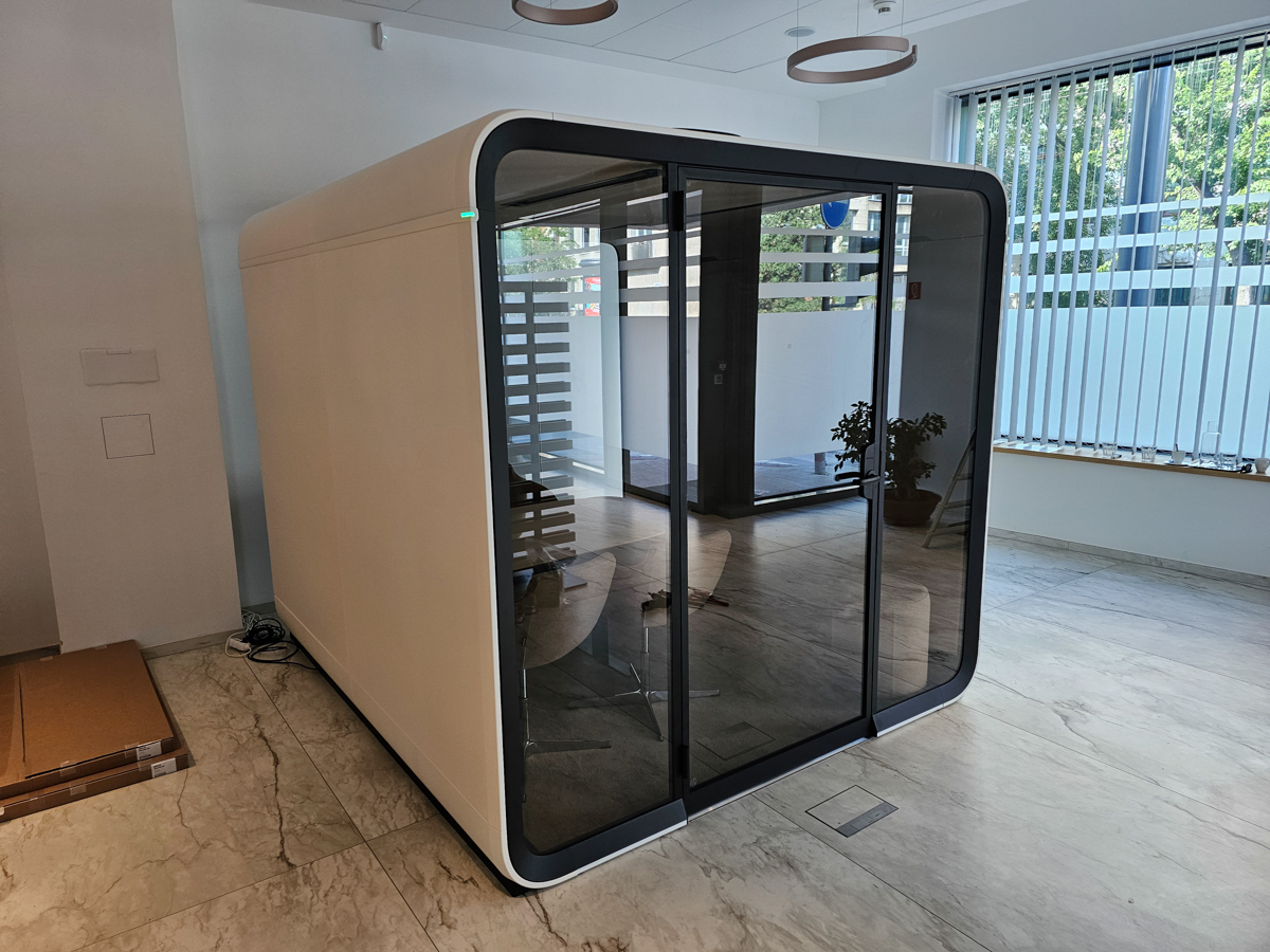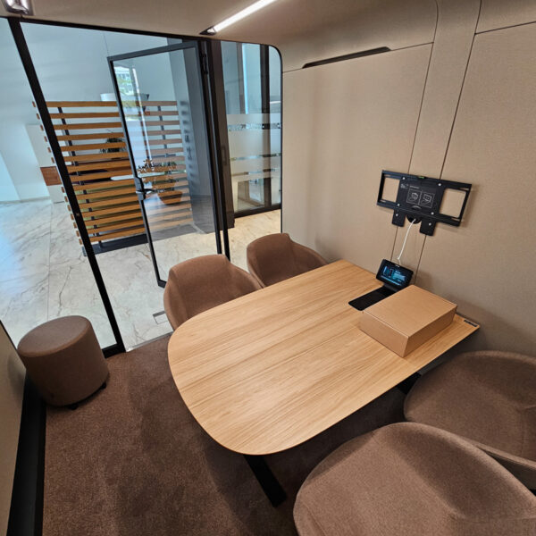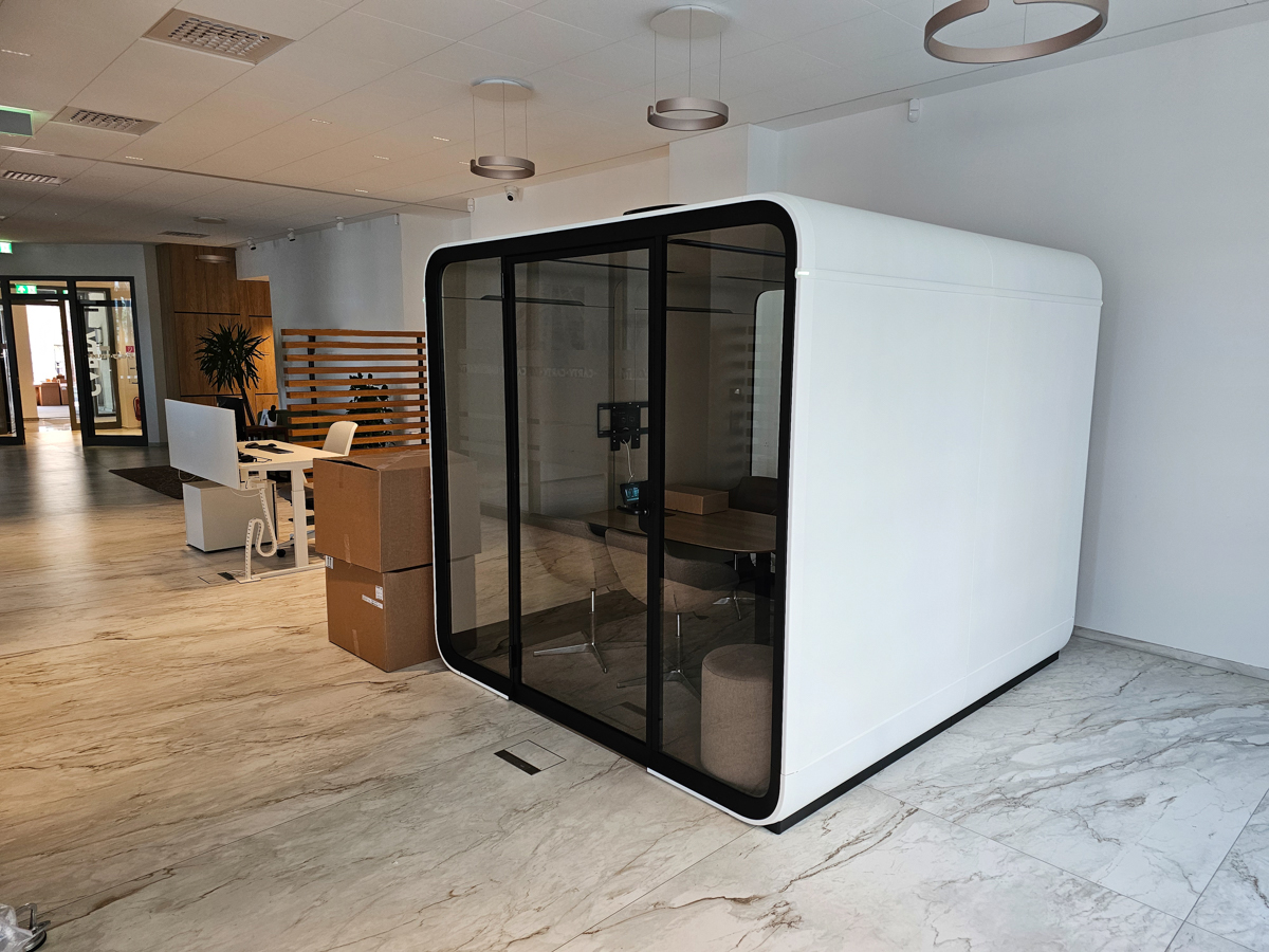 Náš klient hľadal tiché a nerušené miesto na pracovné pohovory, ktoré by zároveň mohlo slúžiť aj na stretnutia s klientmi. Spoločne sme našli ideálne riešenie – prémiový akustický box Framery Six, ktorý sme vybavili nábytkom od výrobcu Narbutas.