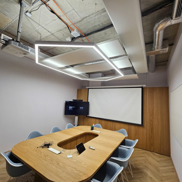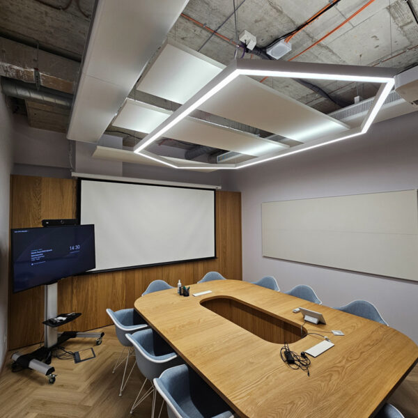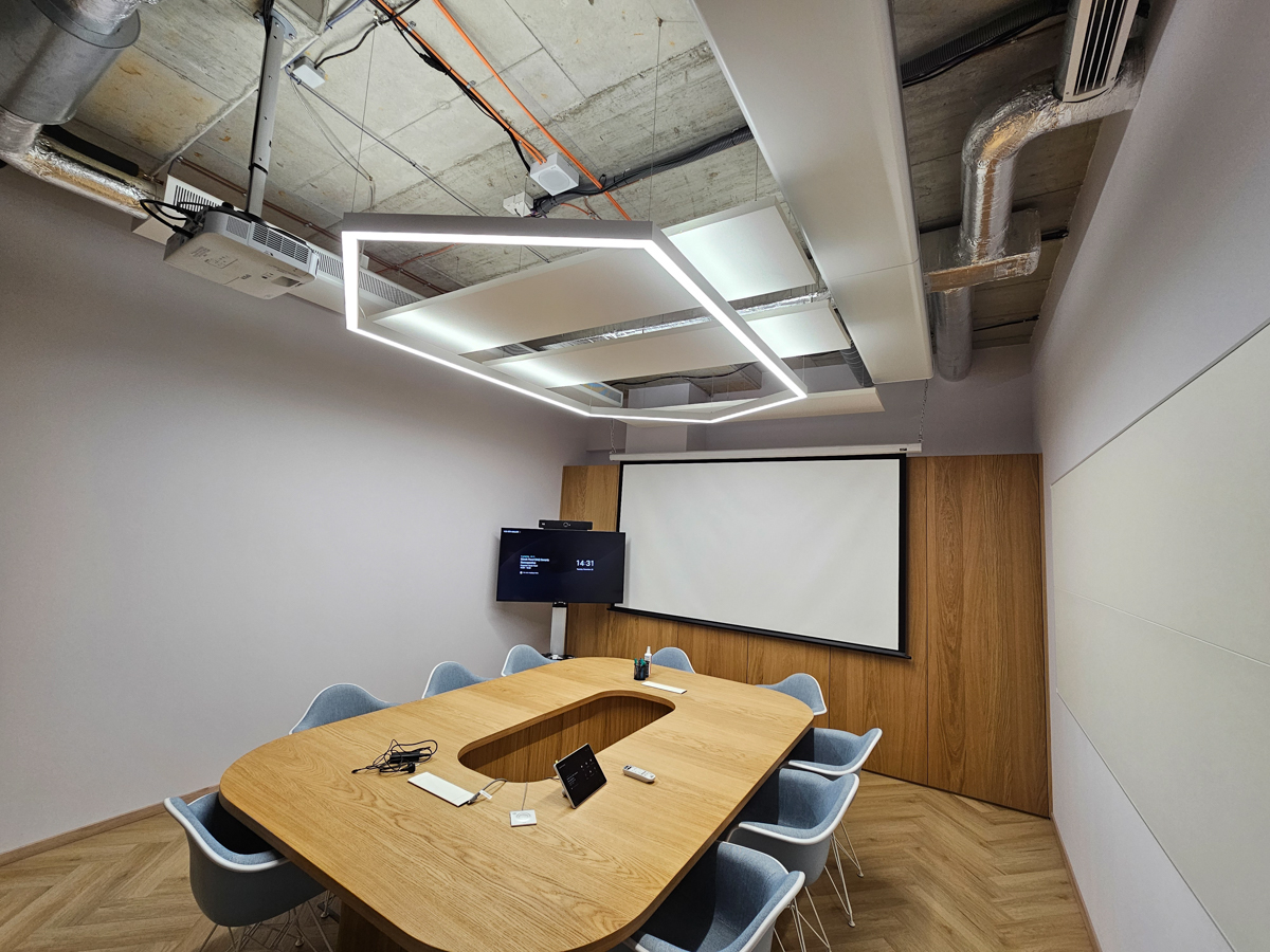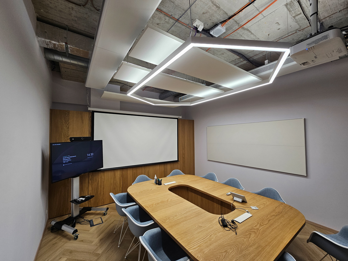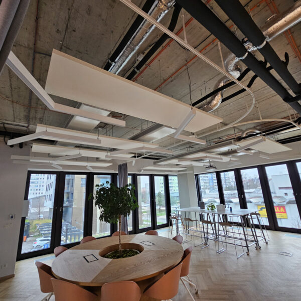 Pri realizácii projektu sme použili závesné akustické panely Solo™ Rectangle a stenové akustické panely Akusto™ Wall A. Tieto panely sa vyznačujú vynikajúcimi zvukovo pohltivými vlastnosťami a elegantným dizajnom.