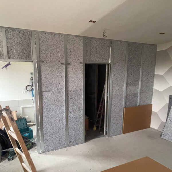 Po obhliadke sme navrhli riešenie prispôsobené konštrukcii stien, ktoré boli tvorené železobetónovými panelmi zo staršej výstavby. Odhlučnili sme dve steny pomocou kombinácie systémov, ktoré výrazne zlepšujú vzduchovú nepriezvučnosť.