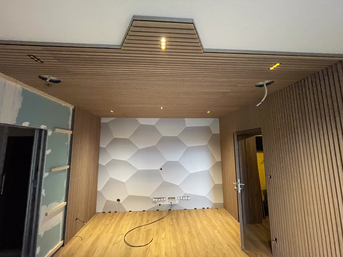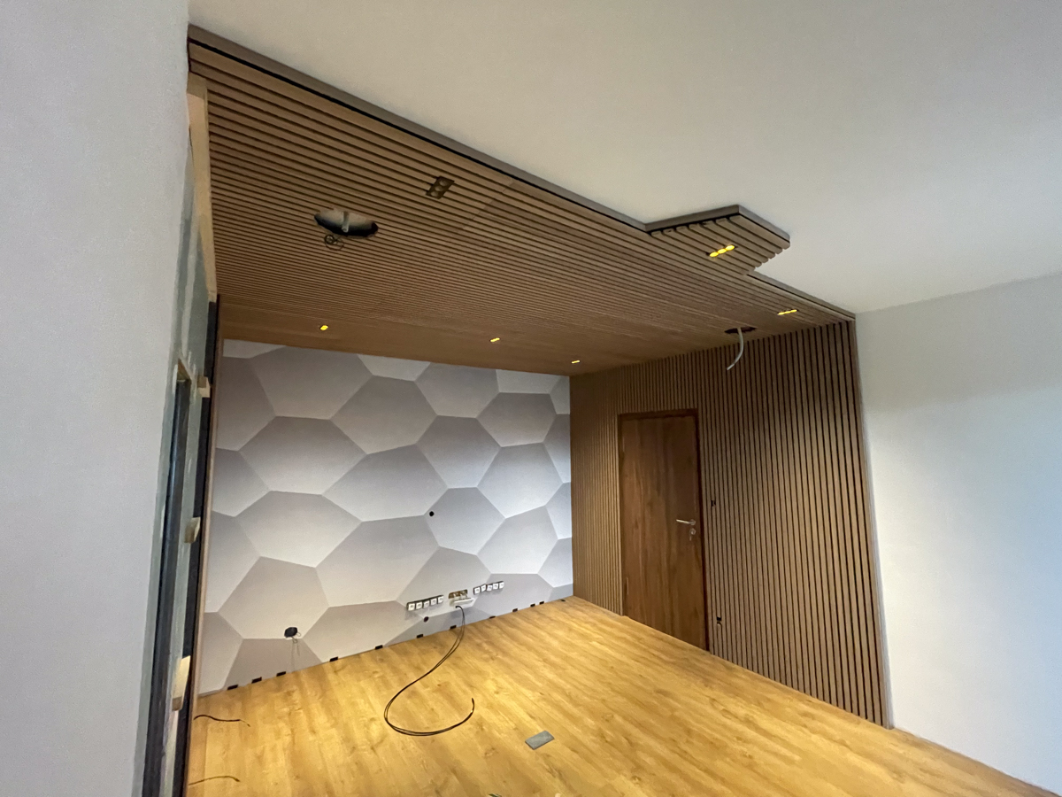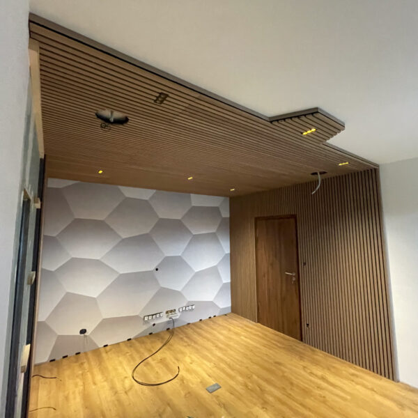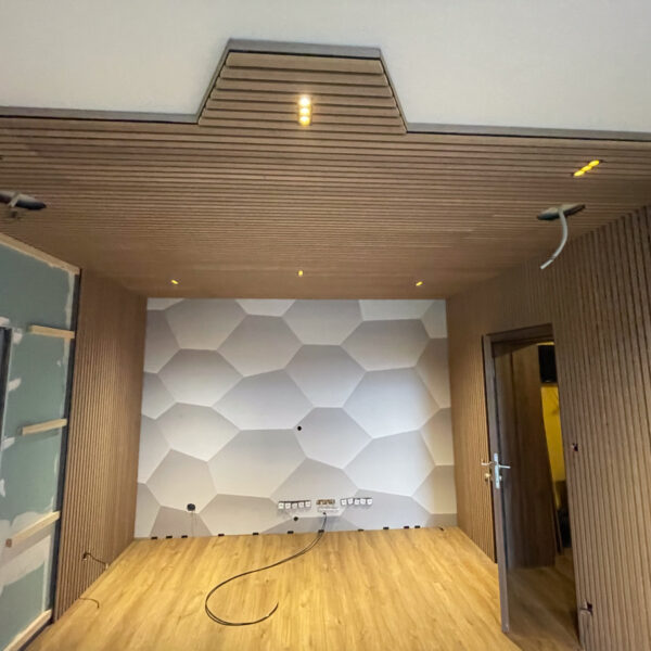 Pre dosiahnutie čo najlepšej akustiky sme na steny miestnosti aplikovali moderný akustický obklad WoodLam. V kombinácii s akustickým absorbérom Zino 30 sa nám podarilo dosiahnuť ideálny balans zvuku v priestore. Tento systém pohlcuje nadbytočné ozveny a zabezpečuje čistý a jasný zvukový prejav, ktorý je ideálny pre posluch hudby aj pre relaxačné aktivity.