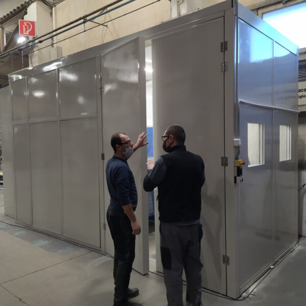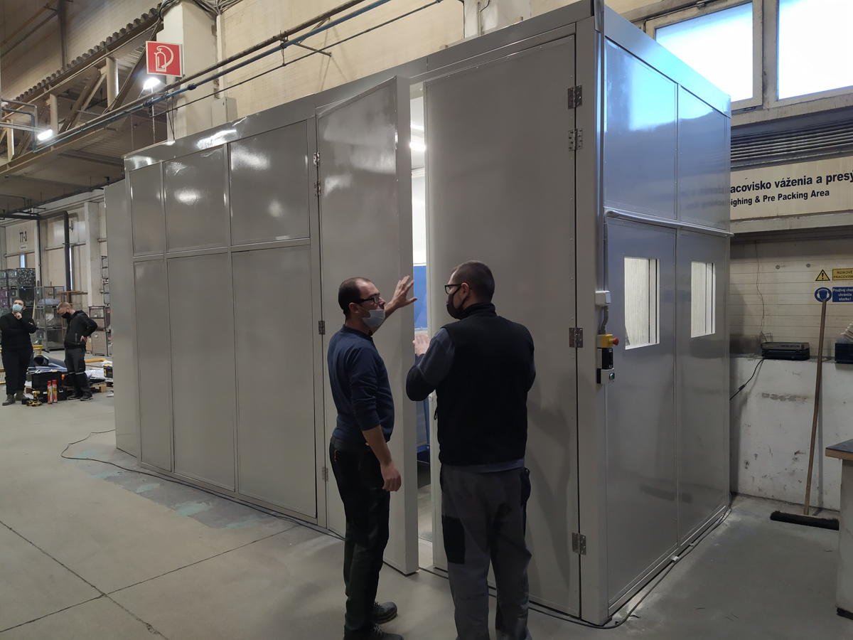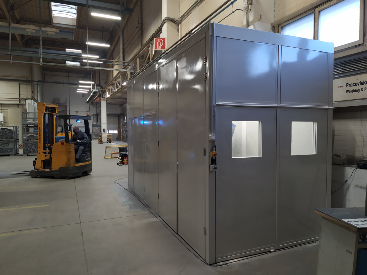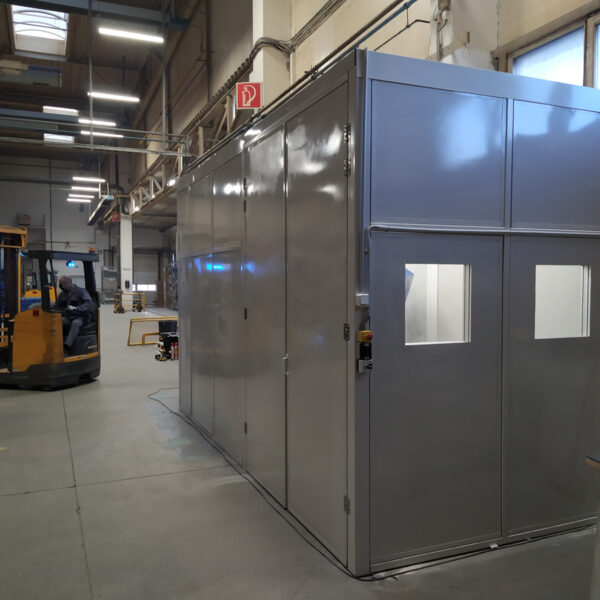 Konštrukciu na odhlučnenie sme navrhli z PZP akustických panelov a oceľovej konštrukcie, ktorá bola celá predpripravená v našej výrobni a dopravená po častiach do haly nášho klienta.