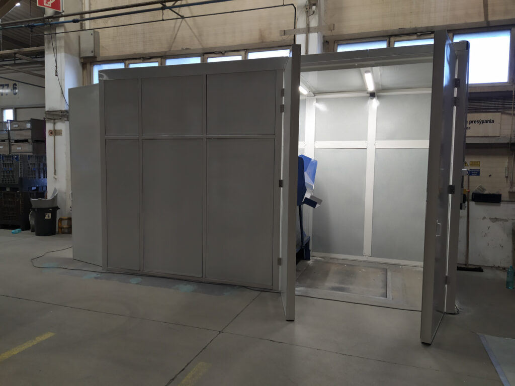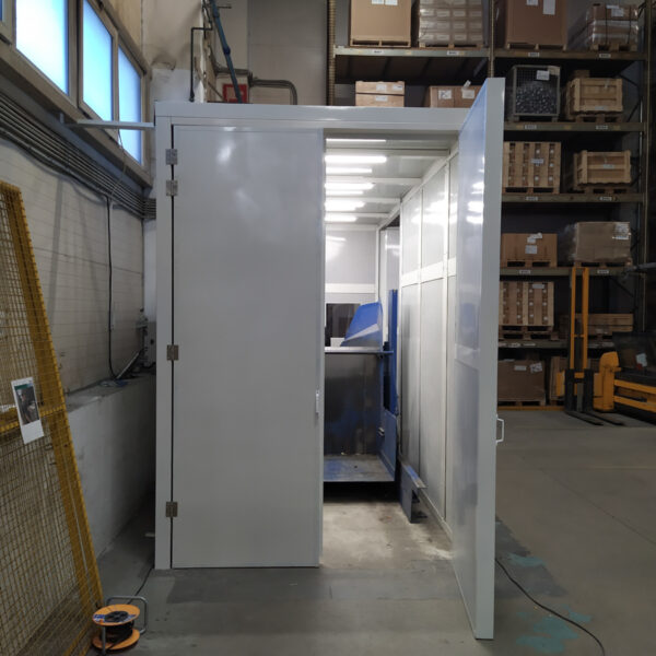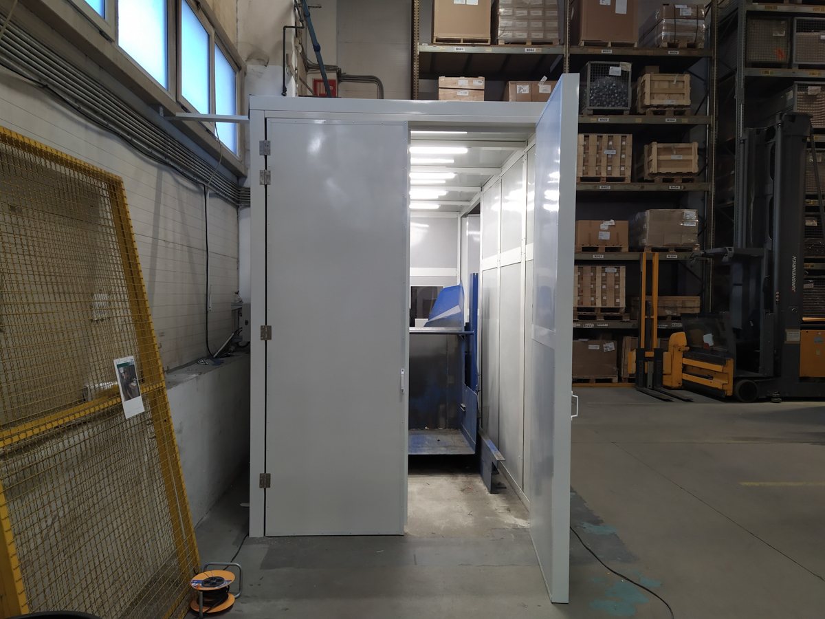 Aj napriek tomu, že do odhlučňovacej kabíny bolo nutné spraviť krídlové dvere z dvoch strán kabíny, jedny na vstup materiálu a druhé na výstup, sme dosiahli značné zníženie hluku a veľkú spokojnosť klienta.