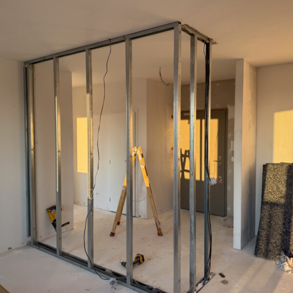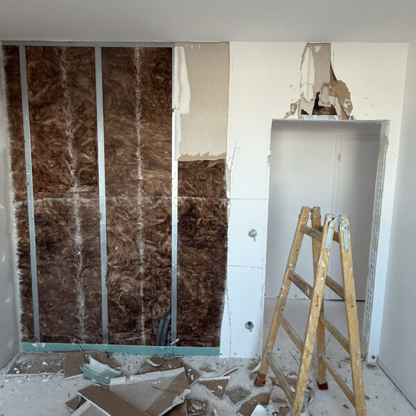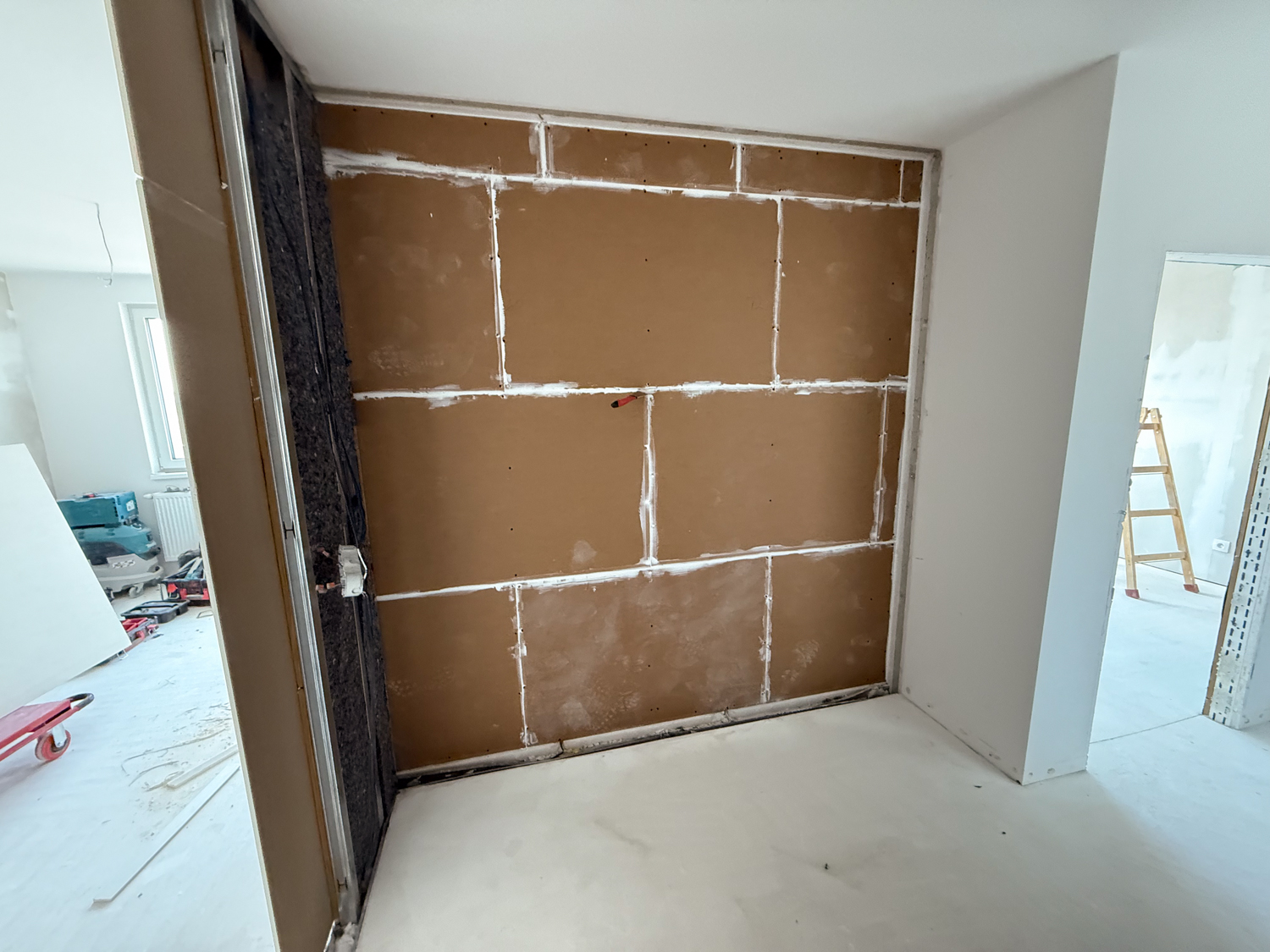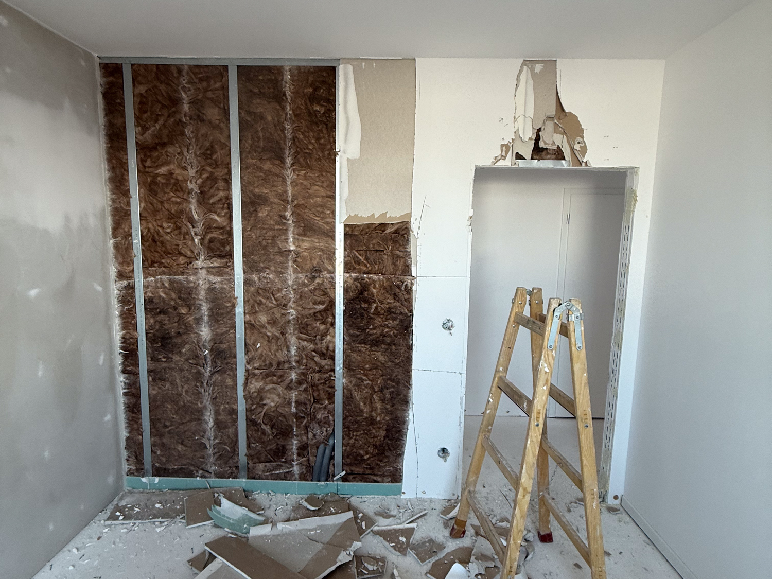 Klient, pre ktorého sme už realizovali prvú fázu odhlučnenia, sa na nás obrátil opäť. Po dokončení úvodnej etapy zistil, že kvôli novým izolačným vrstvám mu ostalo menej miesta na chodbe. Spoločne sme preto navrhli praktické riešenie, pôvodnú konštrukciu sme odstránili a postavili novú samostatne stojacu zvukovoizolačnú priečku, ktorá zároveň lepšie vyhovuje dispozičnému riešeniu.