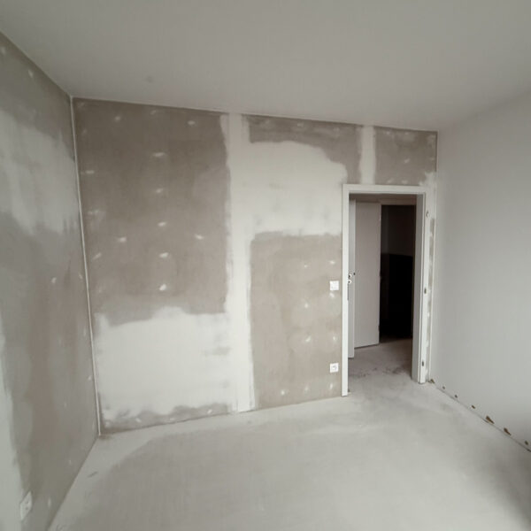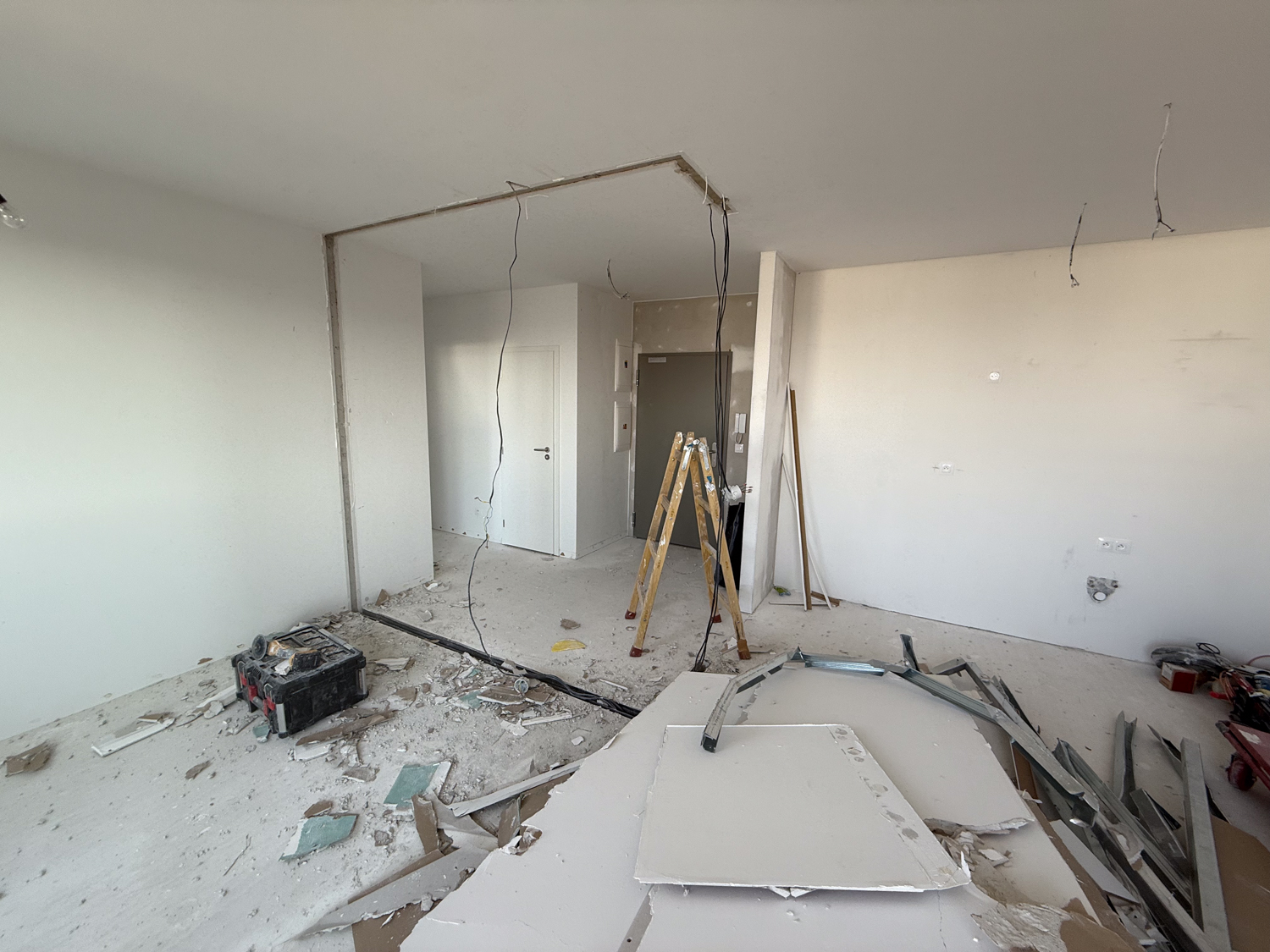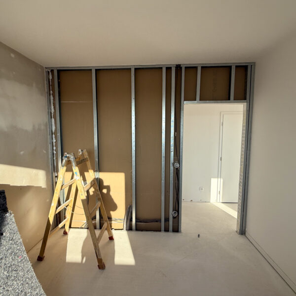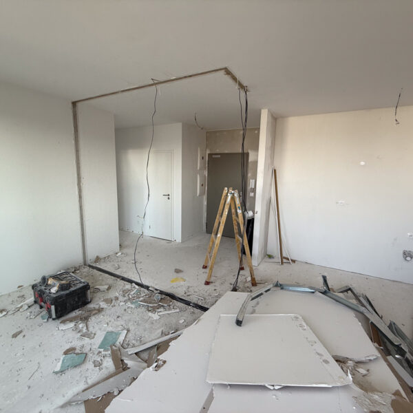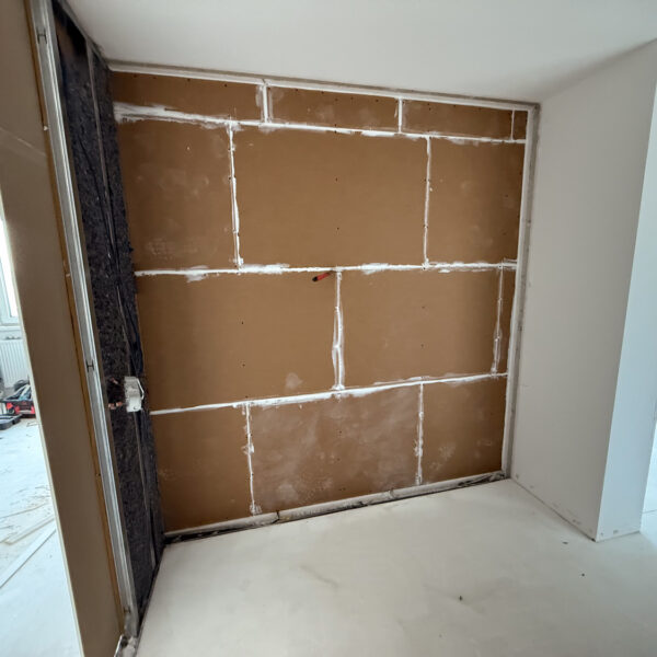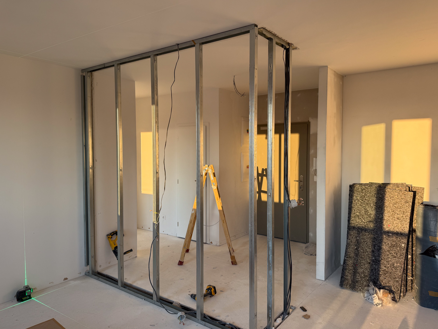Klient, pre ktorého sme už realizovali prvú fázu odhlučnenia, sa na nás obrátil opäť. Po dokončení úvodnej etapy zistil, že kvôli novým izolačným vrstvám mu ostalo menej miesta na chodbe. Spoločne sme preto navrhli praktické riešenie, pôvodnú konštrukciu sme odstránili a postavili novú samostatne stojacu zvukovoizolačnú priečku, ktorá zároveň lepšie vyhovuje dispozičnému riešeniu.