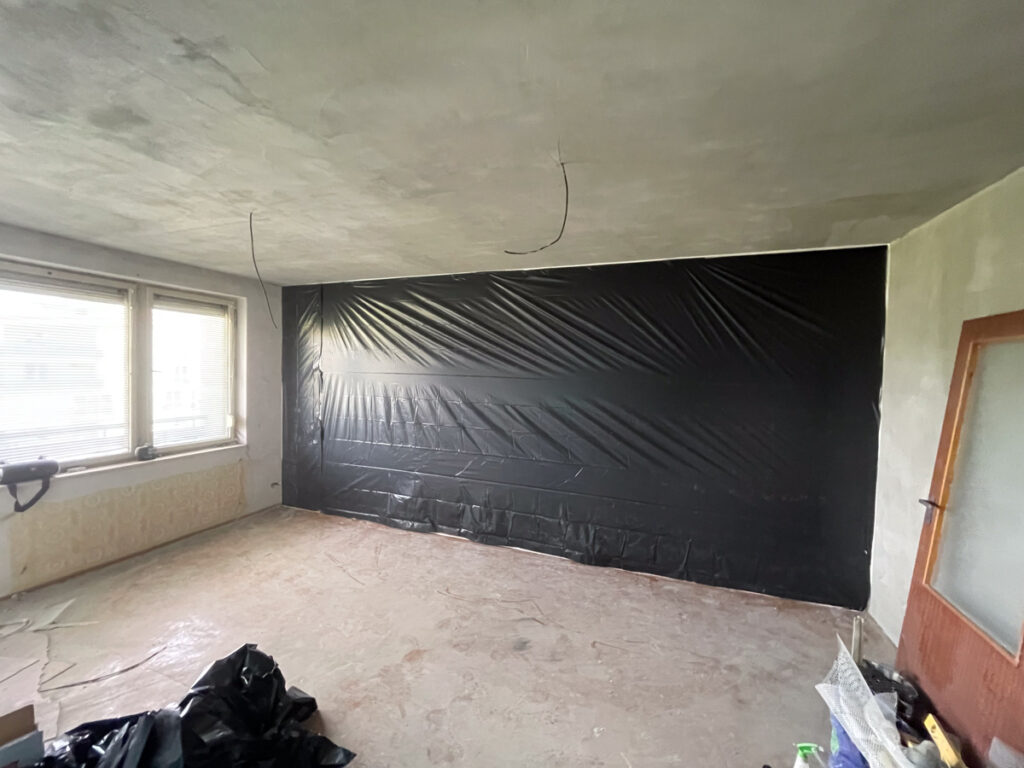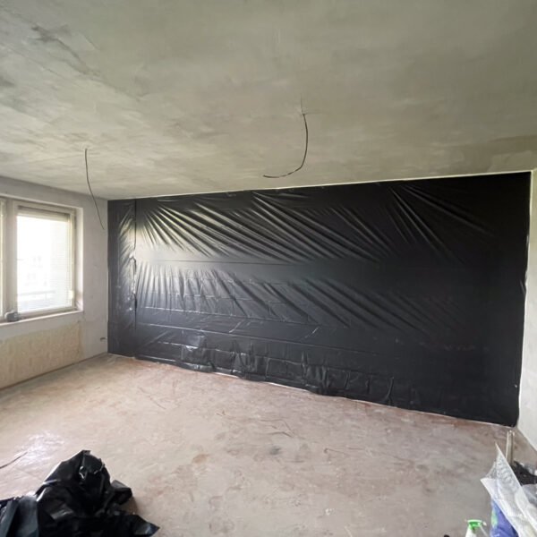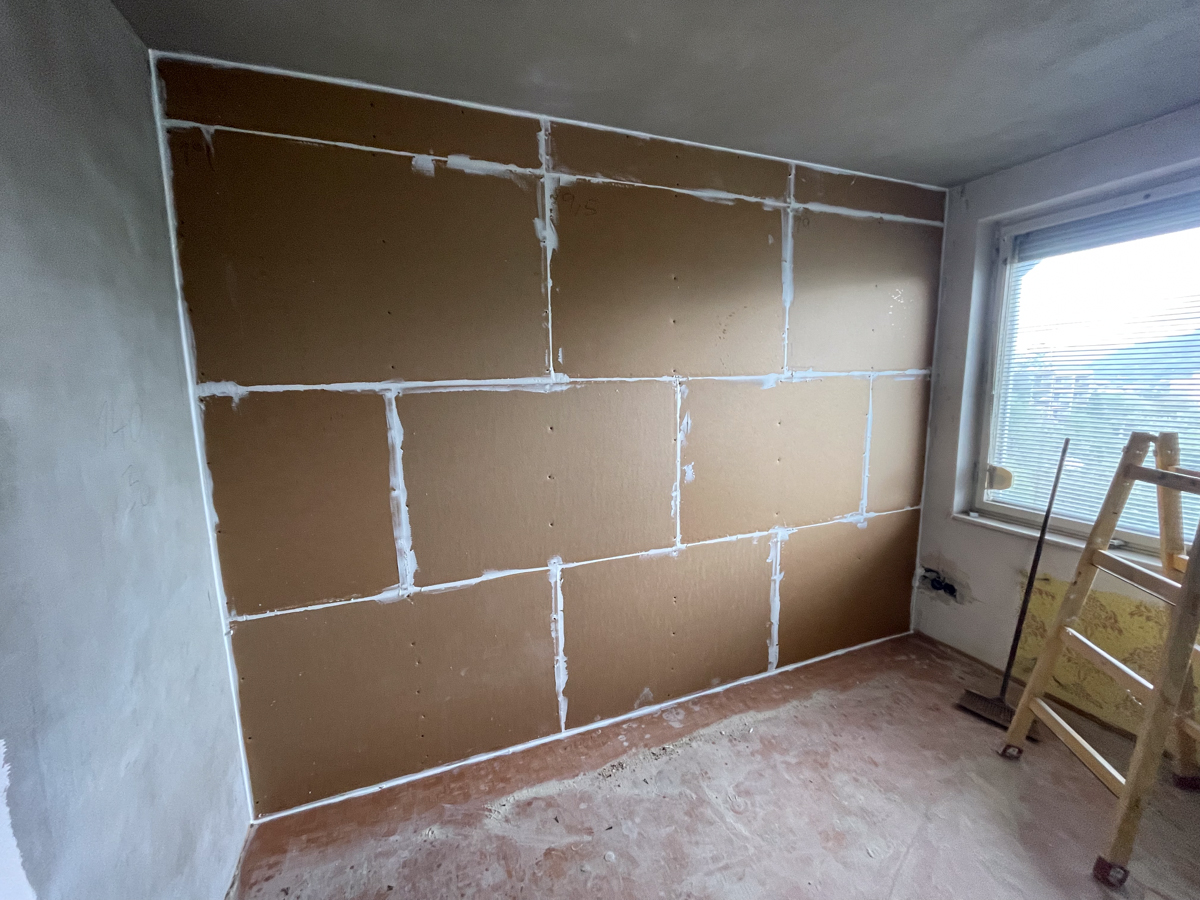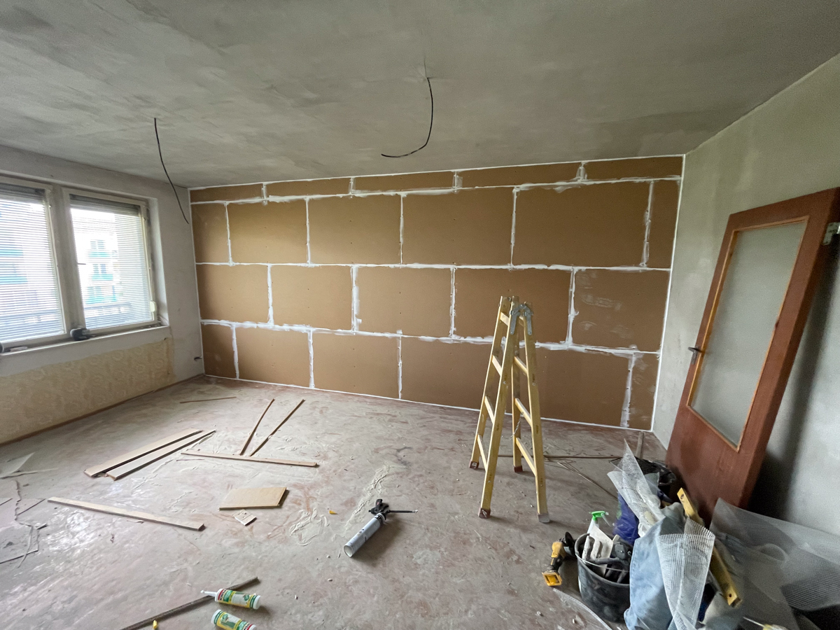 Aby sa dosiahla ešte lepšia zvuková izolácia na jednej zo stien, bola použitá doplnková vrstva nepriezvučného pásu Topsilent Adhesive.
