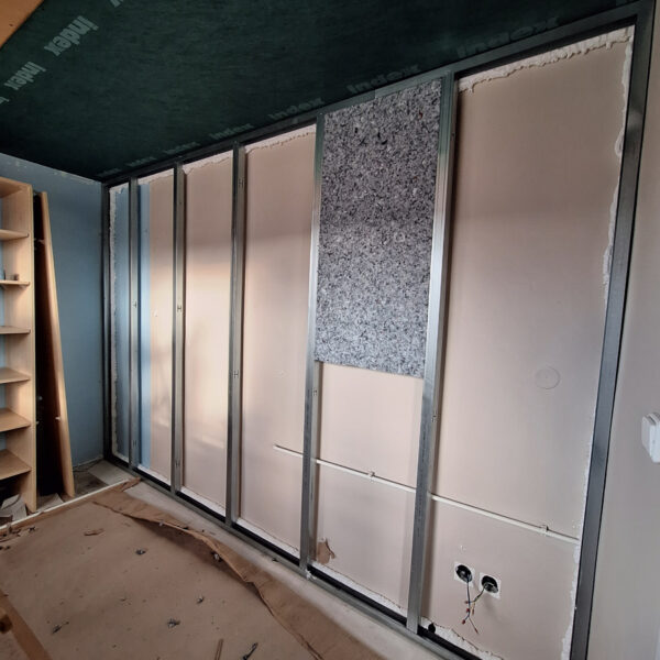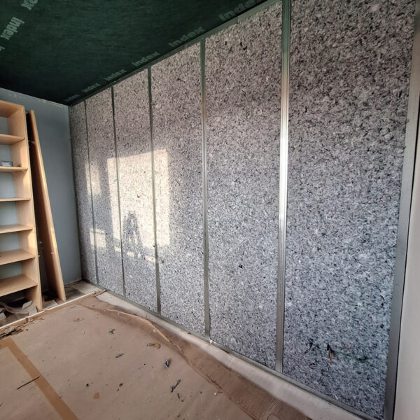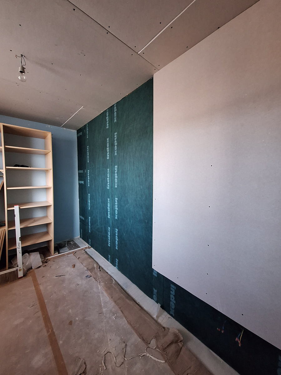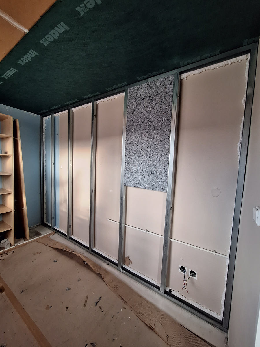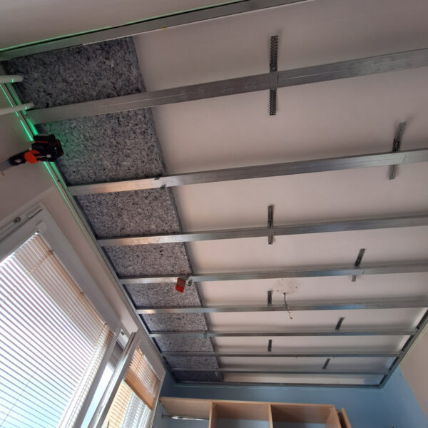 Ako efektívne riešenie sme zvolili systém Extra 1 s pridaním zvukovo izolačného pásu Topsilent Adhesive pre stropy v obývačke, spálni a kuchyni. Rovnaký systém Extra 1 sme použili aj na stenu za posteľou, kde prenikal hluk z kuchyne.