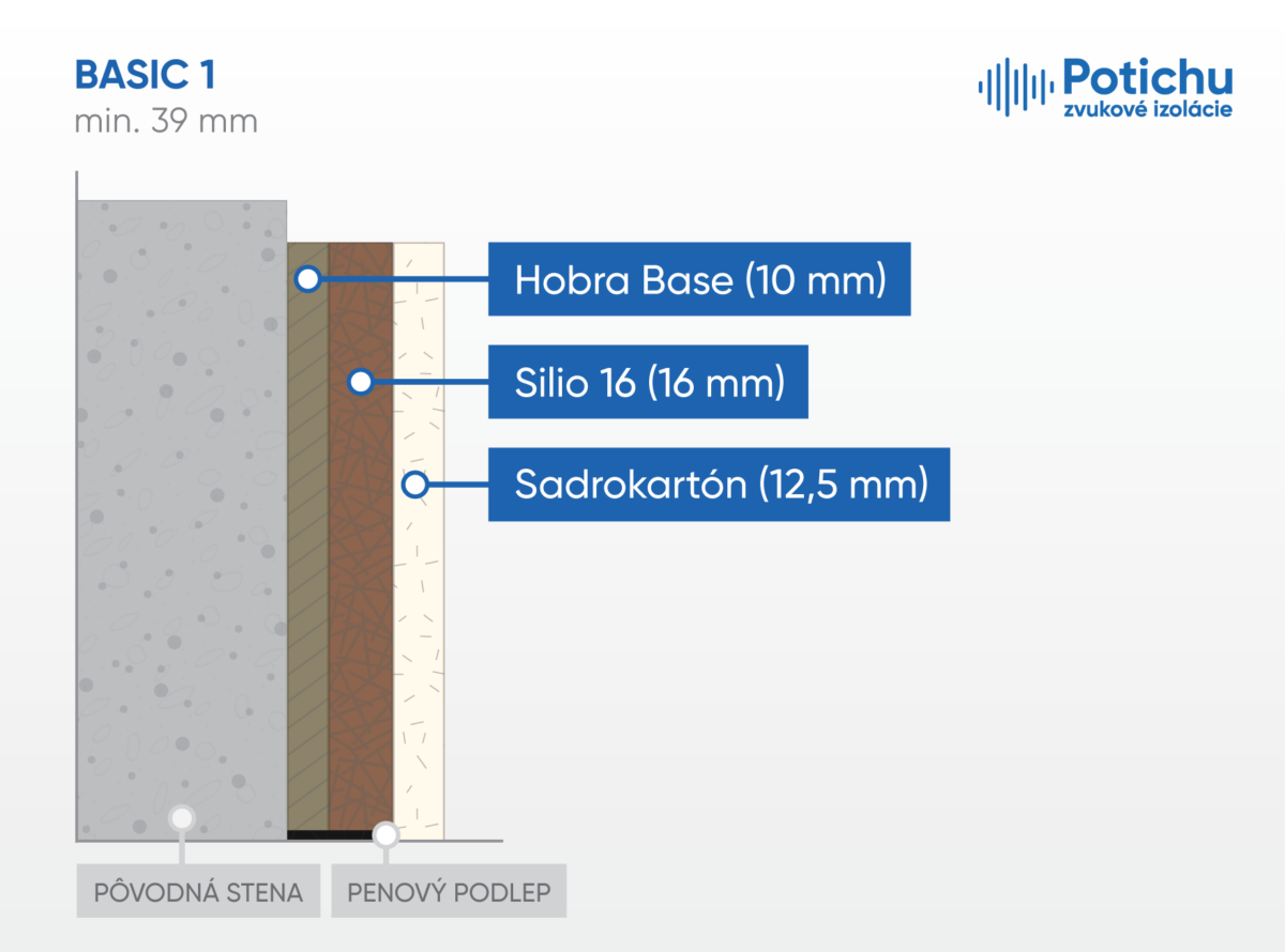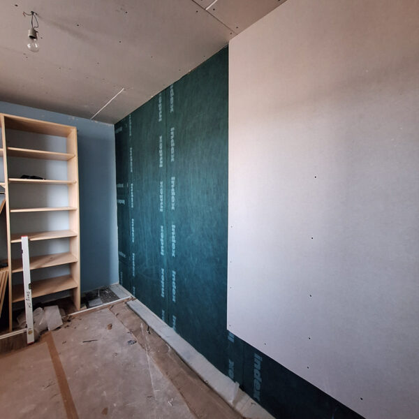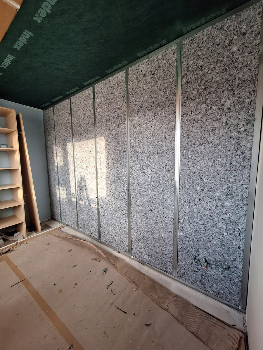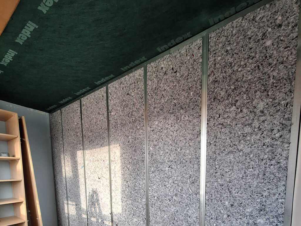 Ako efektívne riešenie sme zvolili systém Extra 1 s pridaním zvukovo izolačného pásu Topsilent Adhesive pre stropy v obývačke, spálni a kuchyni. Rovnaký systém Extra 1 sme použili aj na stenu za posteľou, kde prenikal hluk z kuchyne.