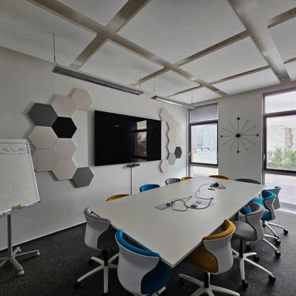 Zákazka pre spoločnosť HMH s.r.o. zahŕňala návrh a inštaláciu akustických panelov Ecophon Solo™ Square a panelov Beelive na stenu v zasadacej miestnosti.