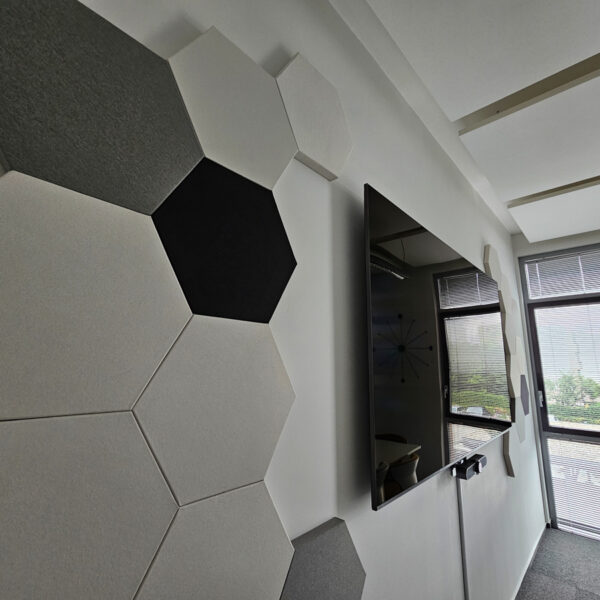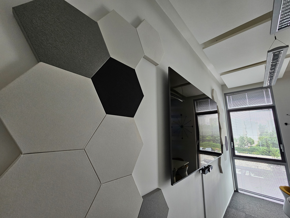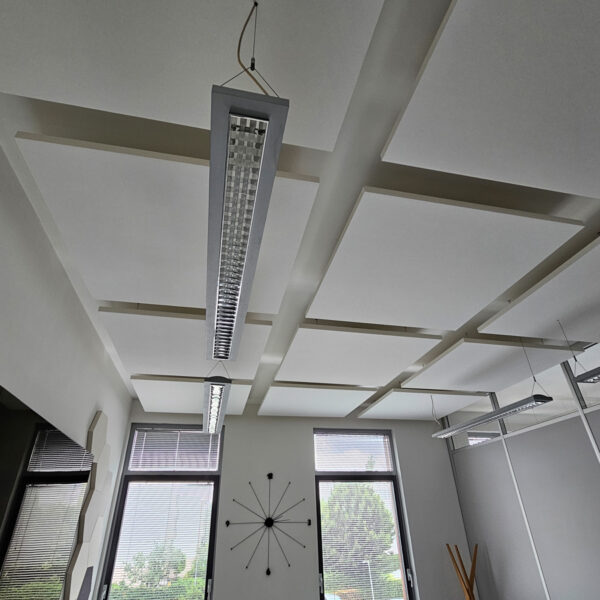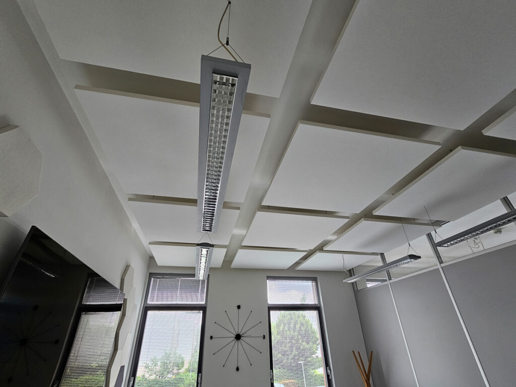 Po dôkladnej analýze priestoru sme navrhli umiestnenie akustických panelov tak, aby efektívne absorbovali nežiaduce ozveny. Stropné a stenové panely nielenže splnili svoj funkčný účel, ale vďaka svojmu dizajnu tiež zásadne zlepšili vizuálny dojem interiéru, dodávajúc mu štýlový a moderný vzhľad.