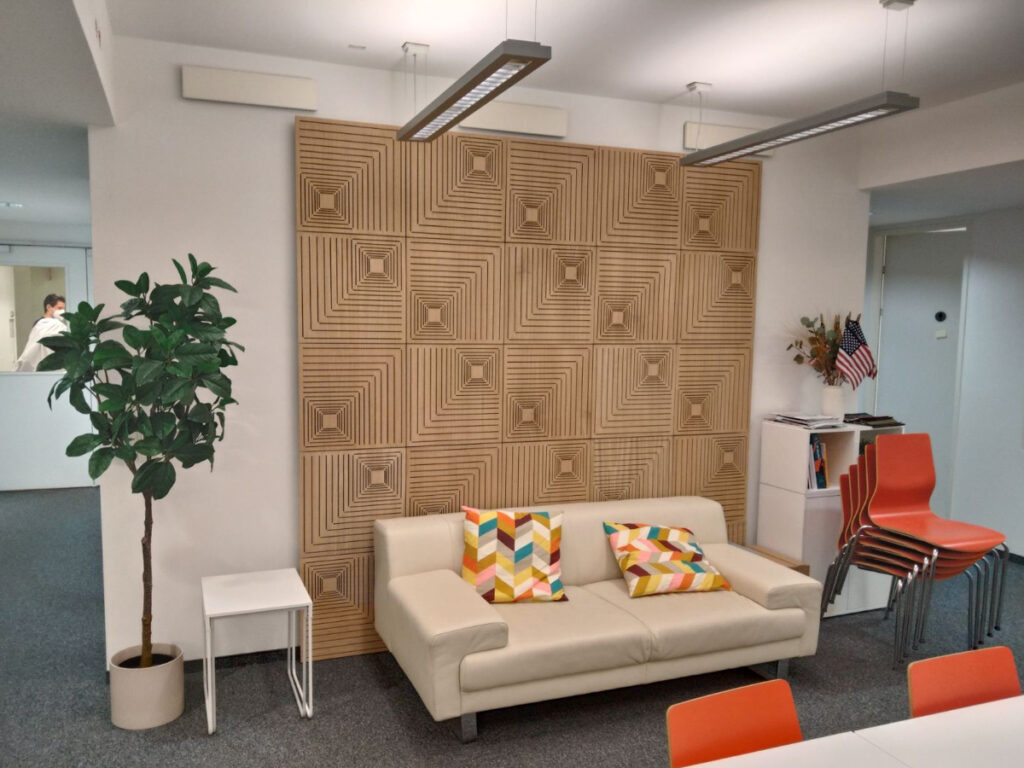 Zároveň sme vo firemných priestoroch použili drevené akustické panely Acer, ktoré nielen efektívne pohlcujú zvuk, ale slúžia aj ako elegantný vizuálny prvok. Tieto riešenia pomohli klientovi vytvoriť funkčné a esteticky príjemné prostredie.