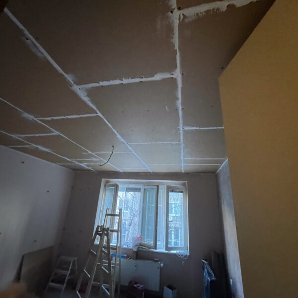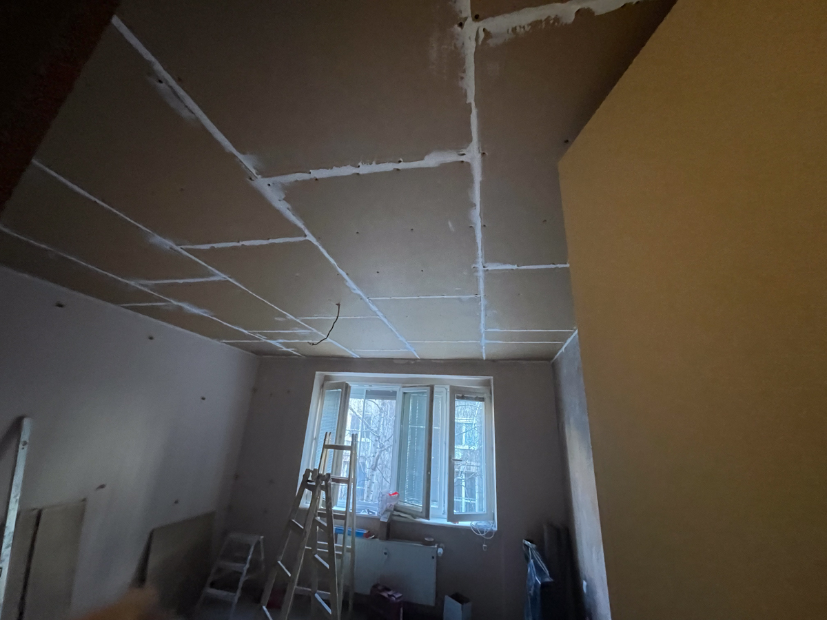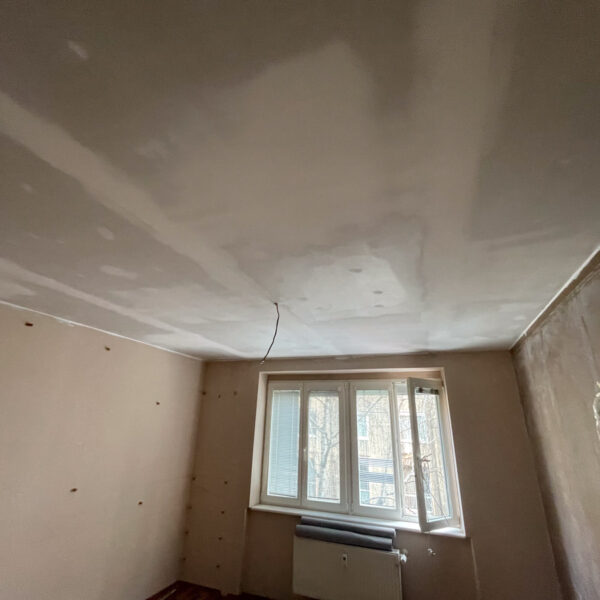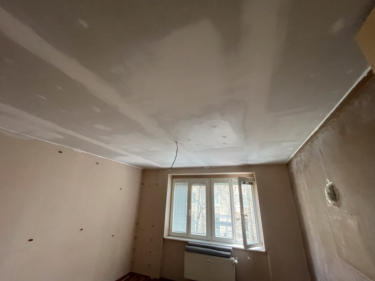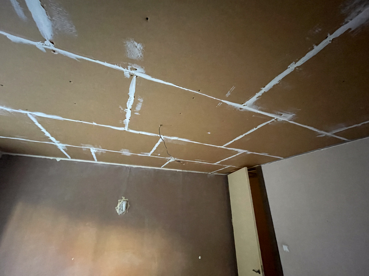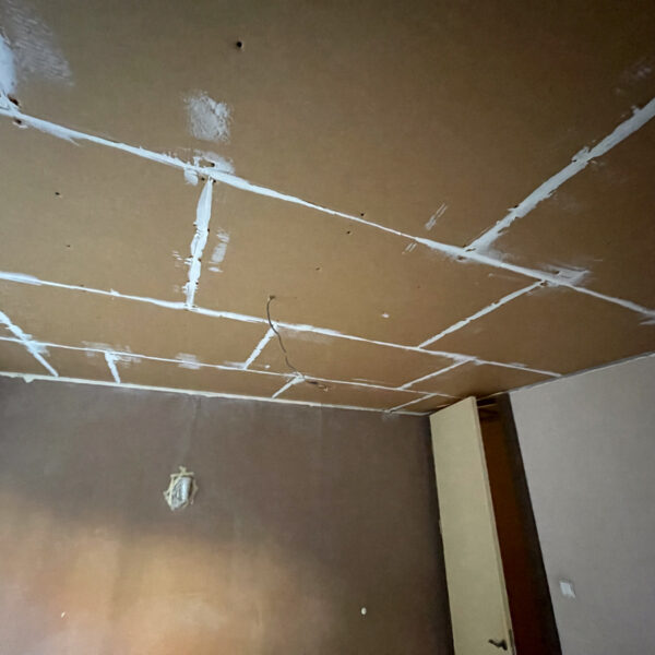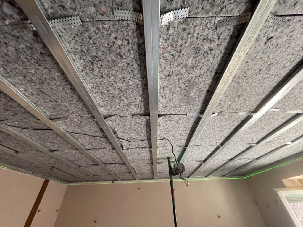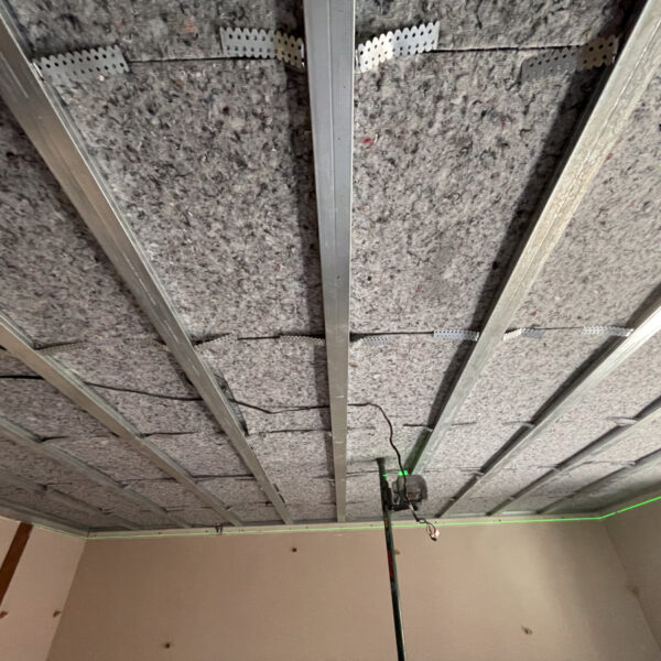 Po obhliadke sme zistili, že pôvodný strop bol riešený odsadeným sadrokartónom bez akejkoľvek výplne, čo neprispievalo k zvukovej izolácii. Tento systém sme preto demontovali a nahradili odhlučňovacím systémom EXTRA 2, ktorý sme nainštalovali v spálni, chodbičke a obývačke.