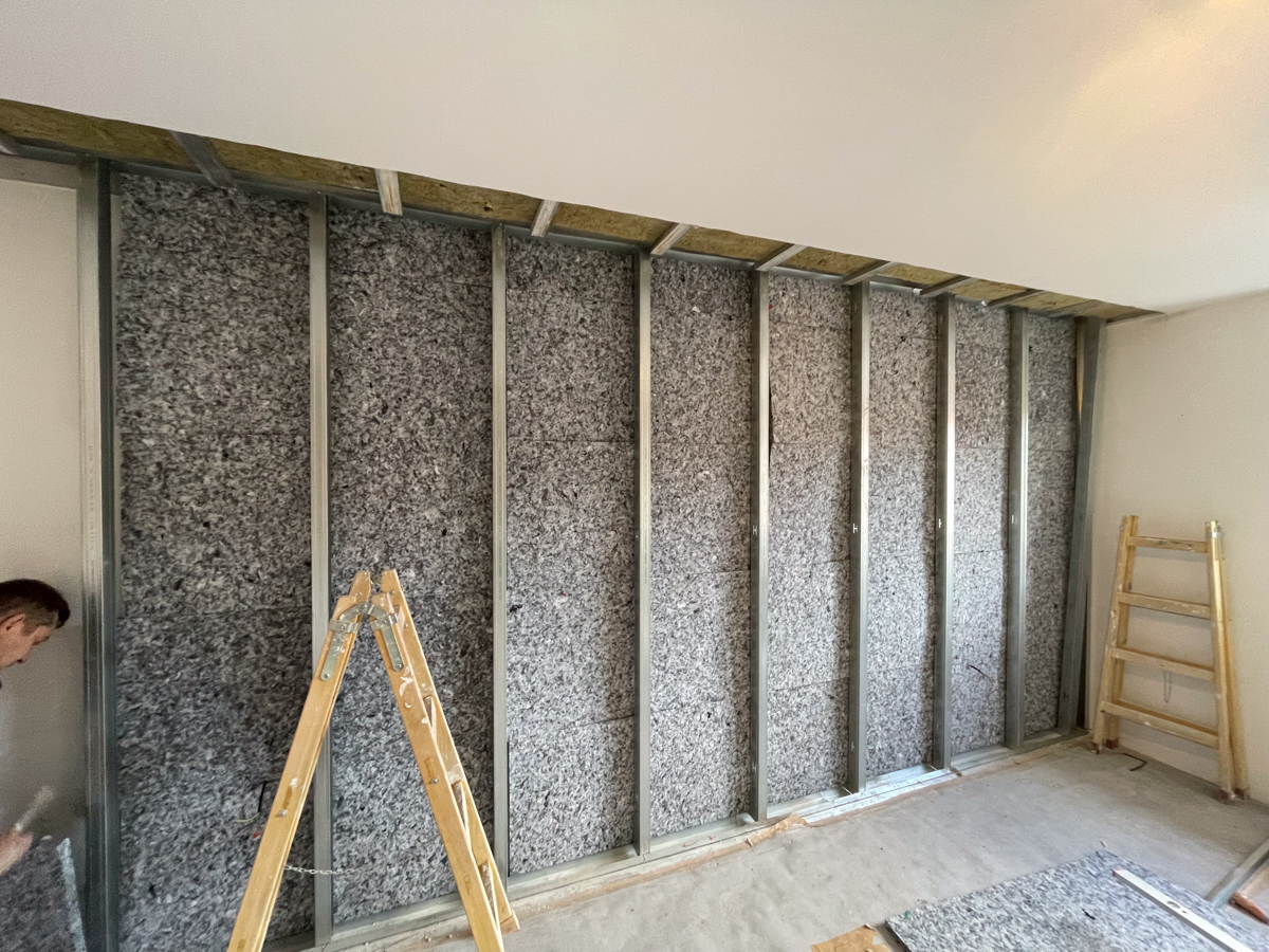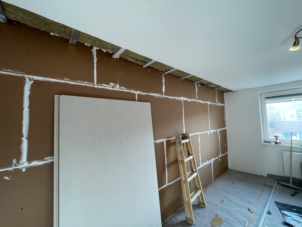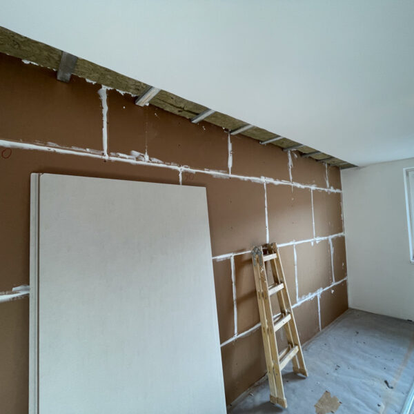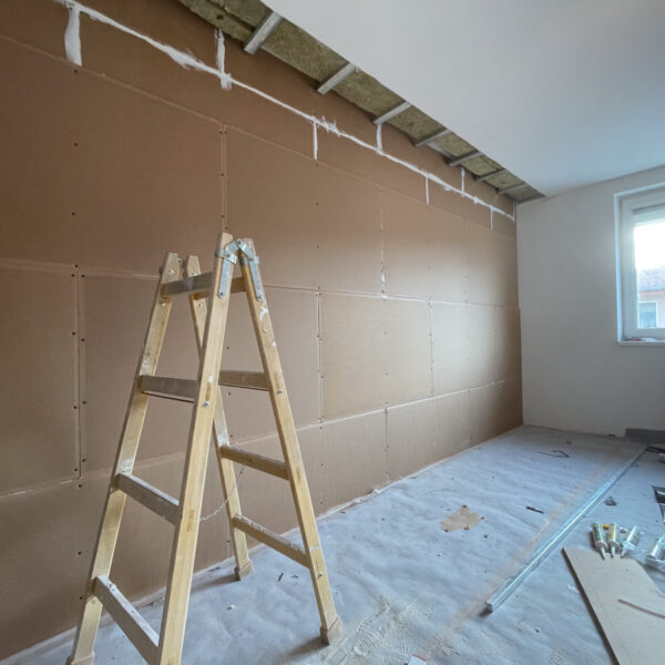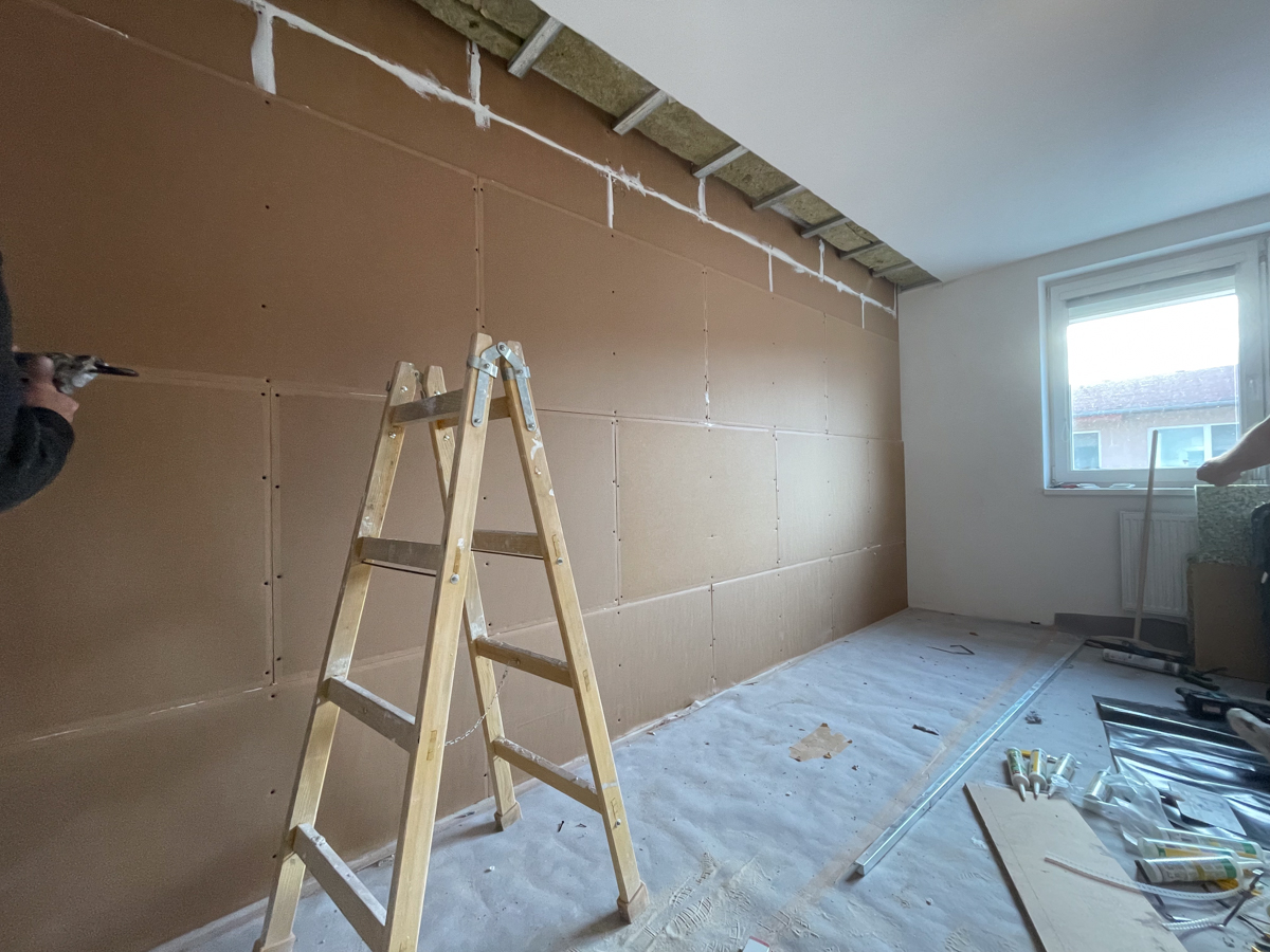 Dôležitou súčasťou realizácie bolo aj otvorenie stropu pri odhlučnenej stene, aby sme mohli systém zasadiť až do stropu. Tento krok bol nevyhnutný na zabránenie prieniku hluku cez stropnú časť steny, ktorá je často problematickým miestom. Ak klienti majú podsadené SDK stropy, vždy dbáme na to, aby odhlučnenie zahŕňalo aj roh stropnej konštrukcie.