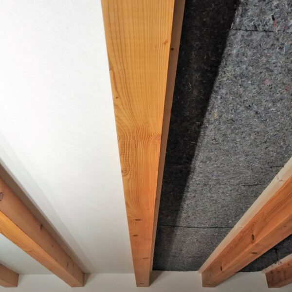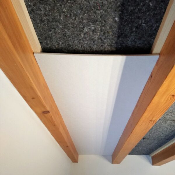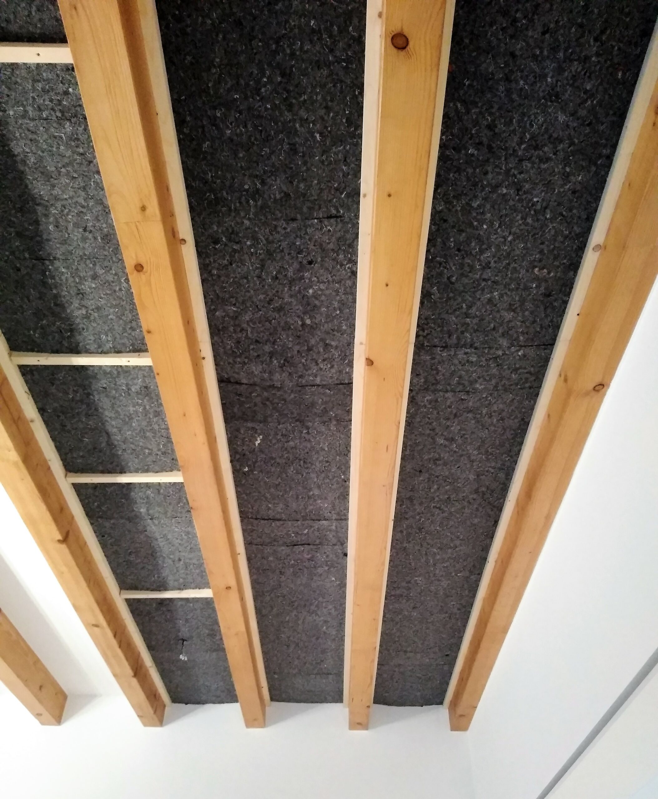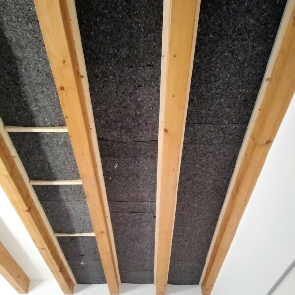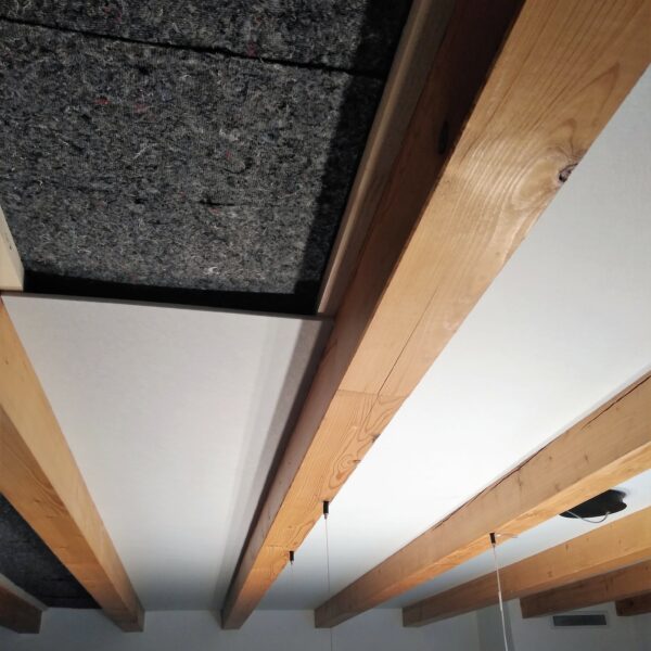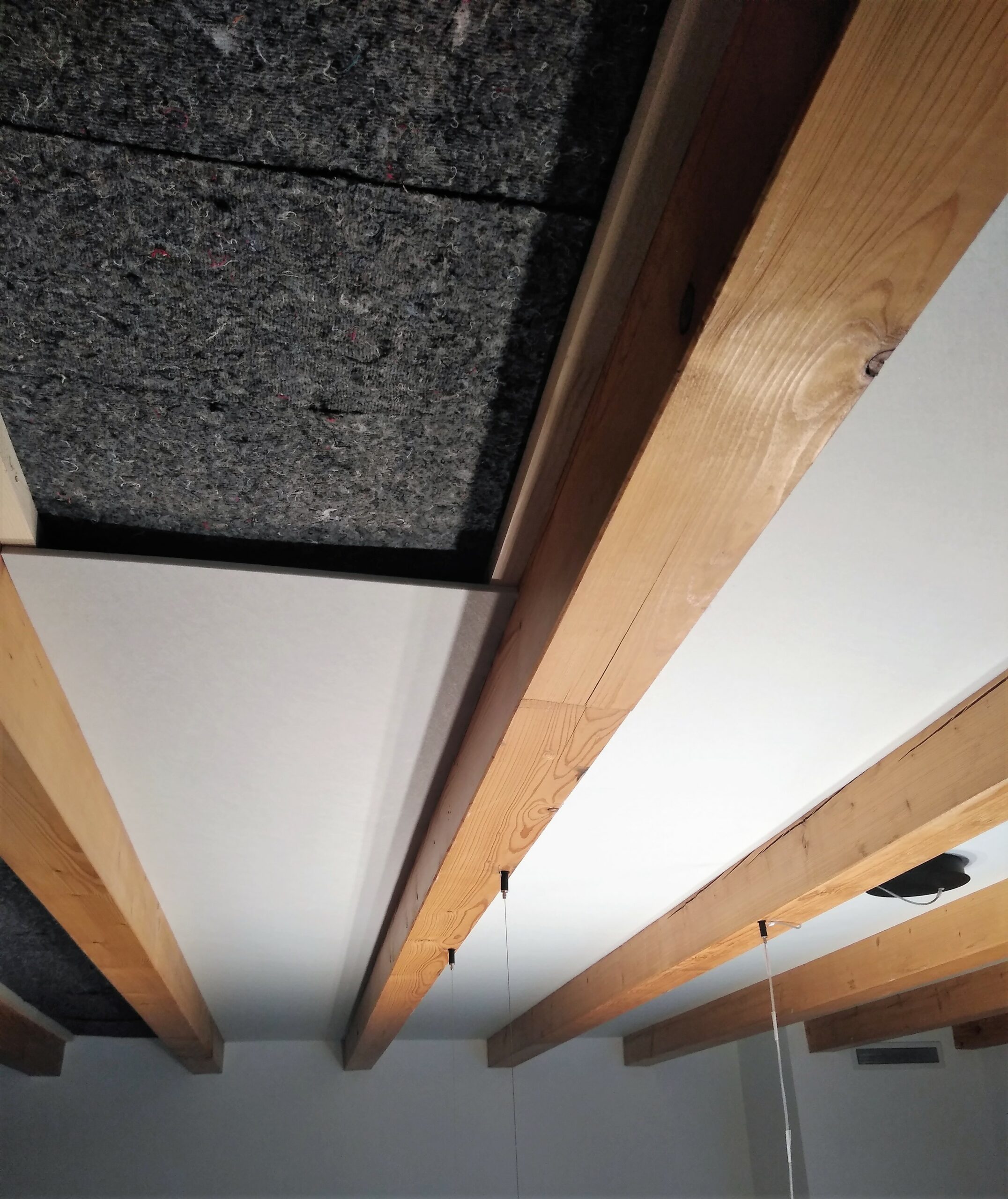 Klient nás oslovil s problémom veľkej ozveny v obývacej miestnosti. Miestnosť mala podvesený trámový strop a klient nechcel veľmi meniť dizajn priestoru. Preto sme navrhli špecifické riešenie, medzi trámy aplikovať pohltivý materiál Zino Acoustic 50 a zakryť ho bielym panelom Pro Reverba.