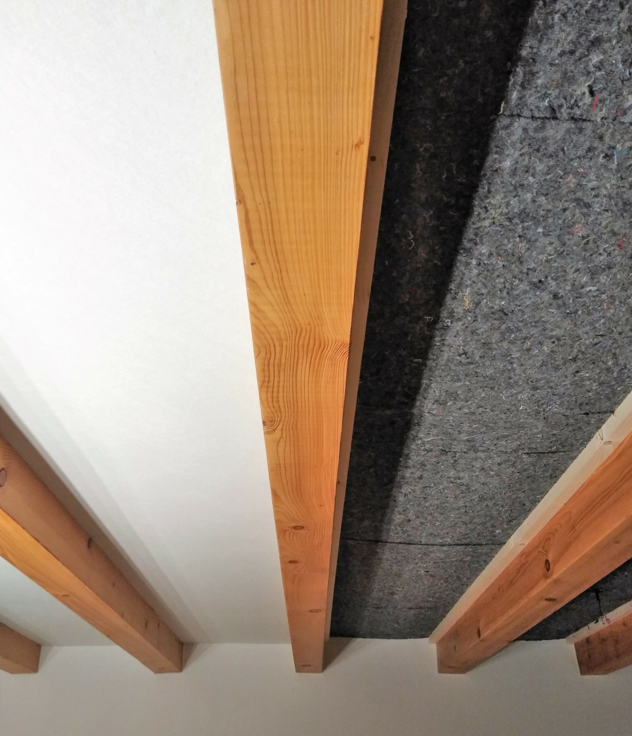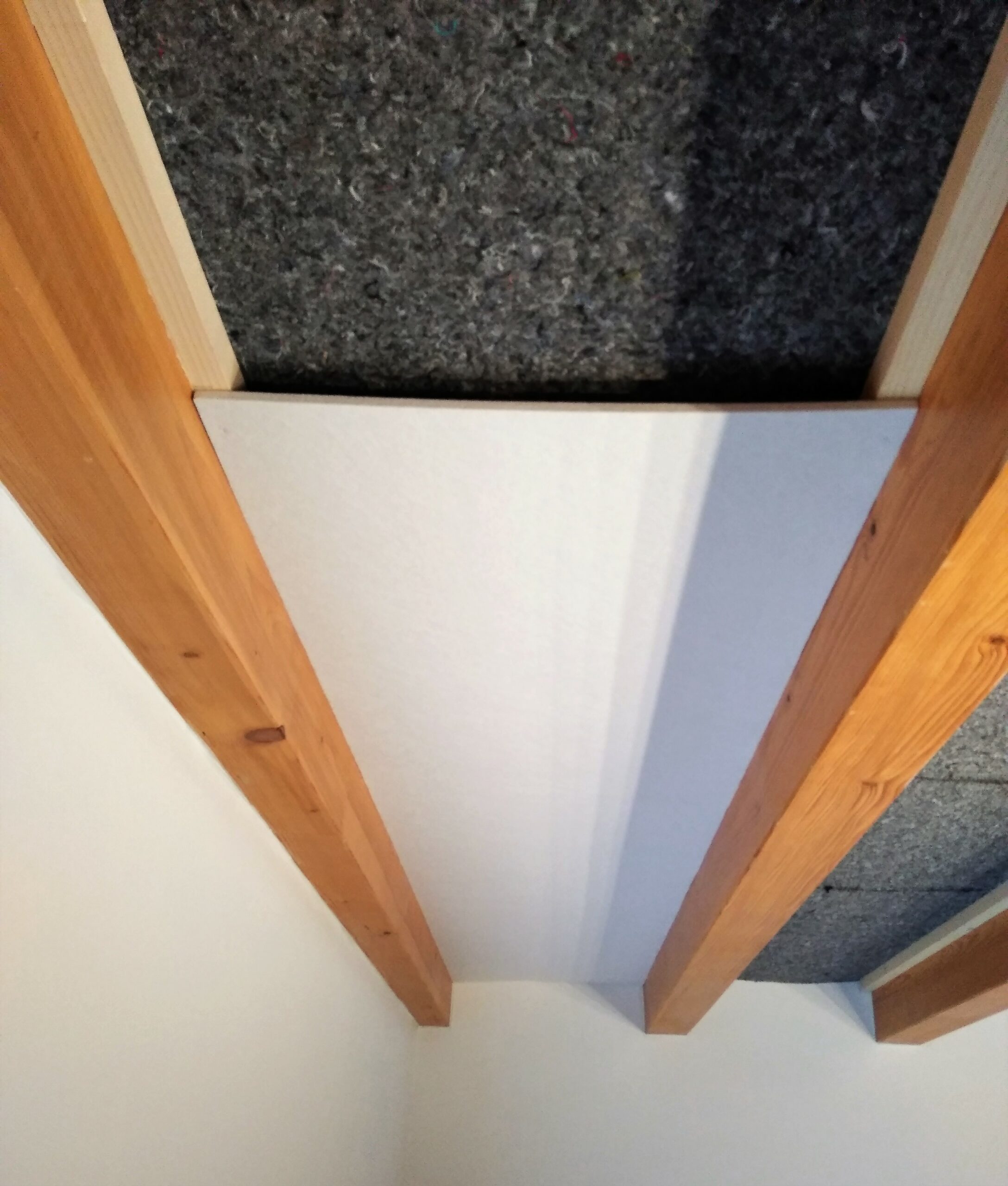 Čo sa týka materiálu, nevedel som poriadne, čo kupujem, (hoc som videl vzorku ale pri takom rozmere a aplikácií to nepostačovalo na úplnú predstavu) a ani ako a či to zaberie. Aj finálny zjav bol otázny (aj zníženie priznaných drevených trámov), no výsledok dopadol nad očakávania. Síce vidno, že to nie je pôvodný strop (iný farebný odtieň, iná štruktúra, jemné spoje), avšak ak na to neupozorním, asi si to nikto ani nevšimne a samotná akustika je vynikajúca, teda zvuk je úplne utlmený.