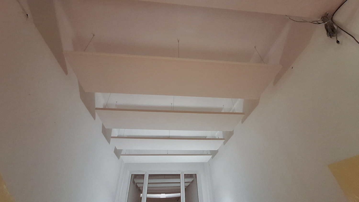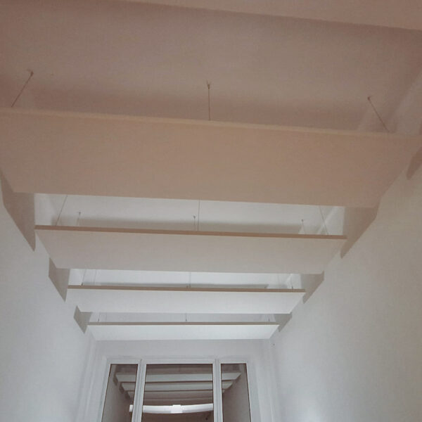Chodby a schodisko, ktoré boli akusticky náročné kvôli absencii nábytku, sme vybavili podvesenými panelmi v rôznych výškach a rozmeroch. Okrem zlepšenia akustiky tieto prvky vizuálne oživili priestor a narušili jeho pôvodnú fádnosť.